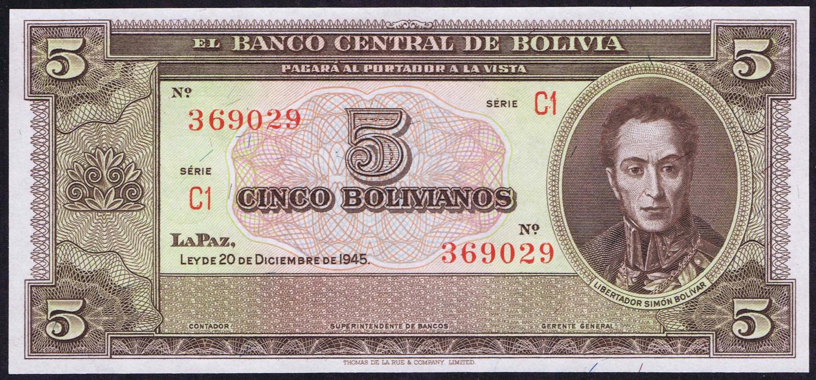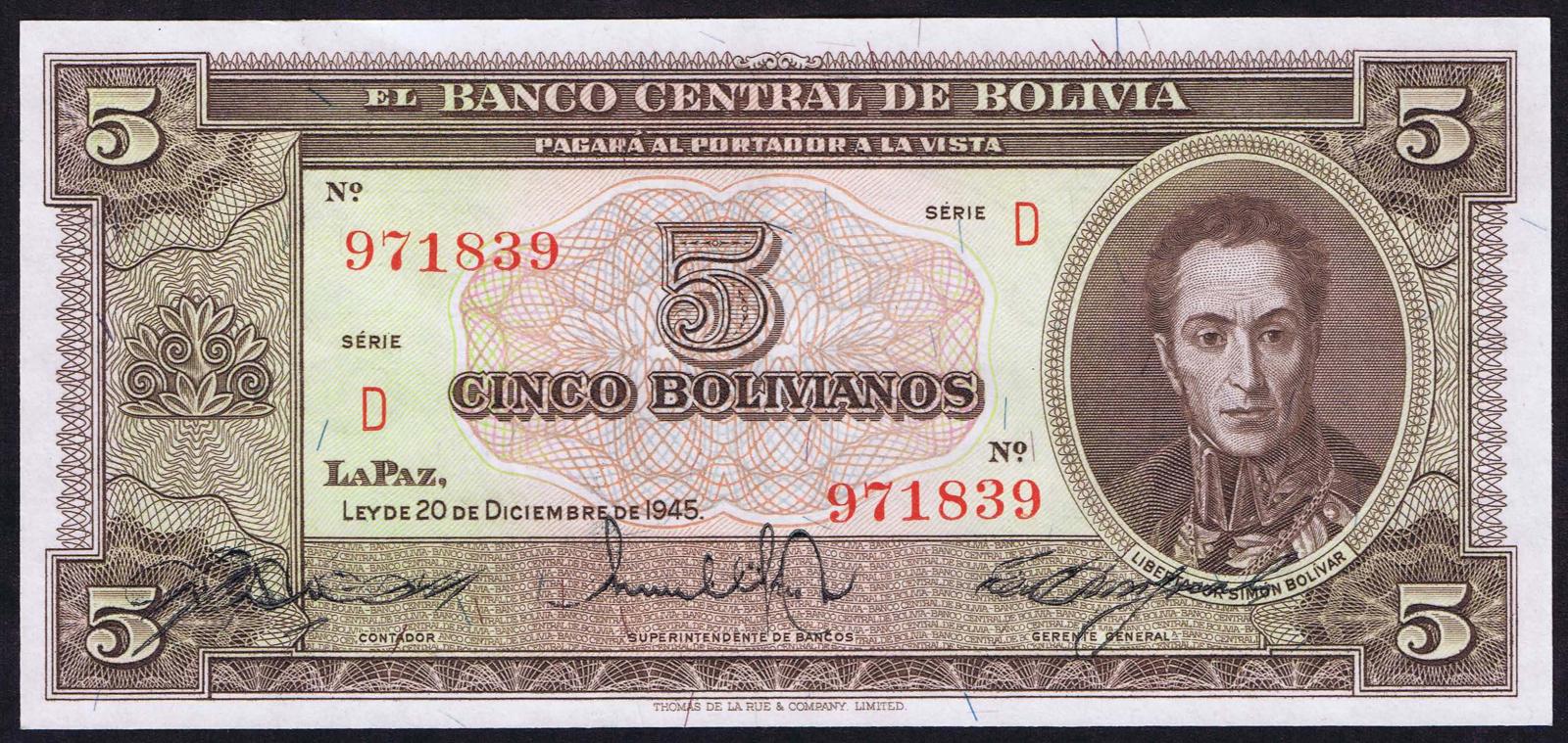 Bolivia pick 138d: 5 Bolivianos from 1945