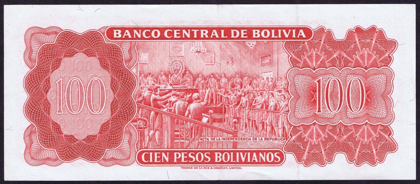 Law of 1962 (1983). Red on multicolored underprint. Portrait of Simon Bolivar at right, arms at left, red serial number and security thread at left center. Higher number prefixes (13E-19T). Two signature varieties. Back: engraved, scene of the declaration of the Bolivian Republic, new denomination only. Printer: TDLR.