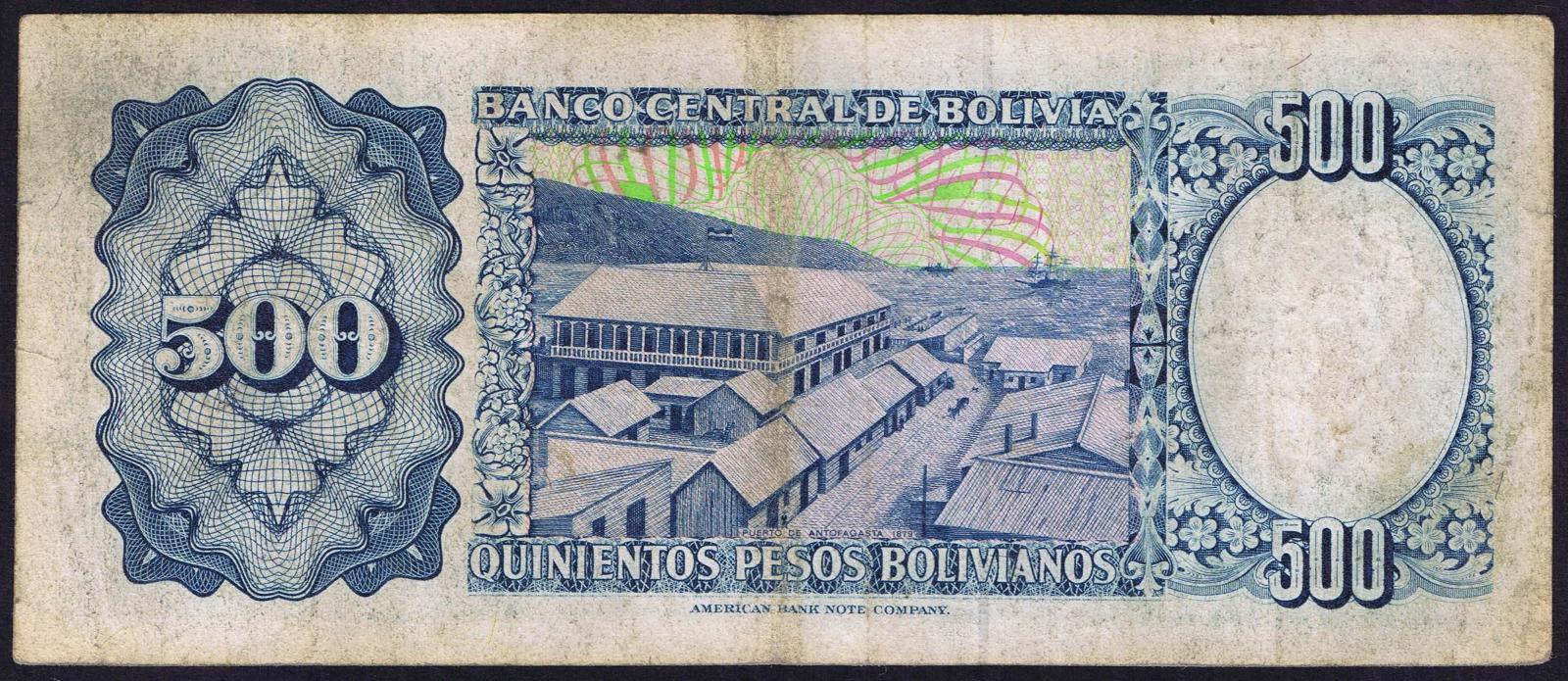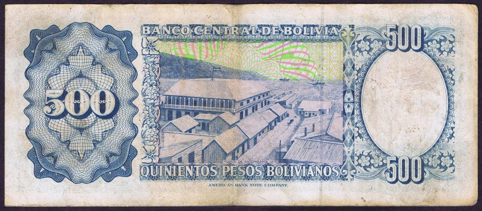 1.6.1981. Deep blue, blue-green, and black on multicolored underprint. Arms at center, portrait of Eduardo Avaroa at right and as watermark at left. Back blue on multicolored underprint. View of Puerto de Antofagasta, circa 1879 at center. Series A. Printer: ABNC. 2 Signature varieties.