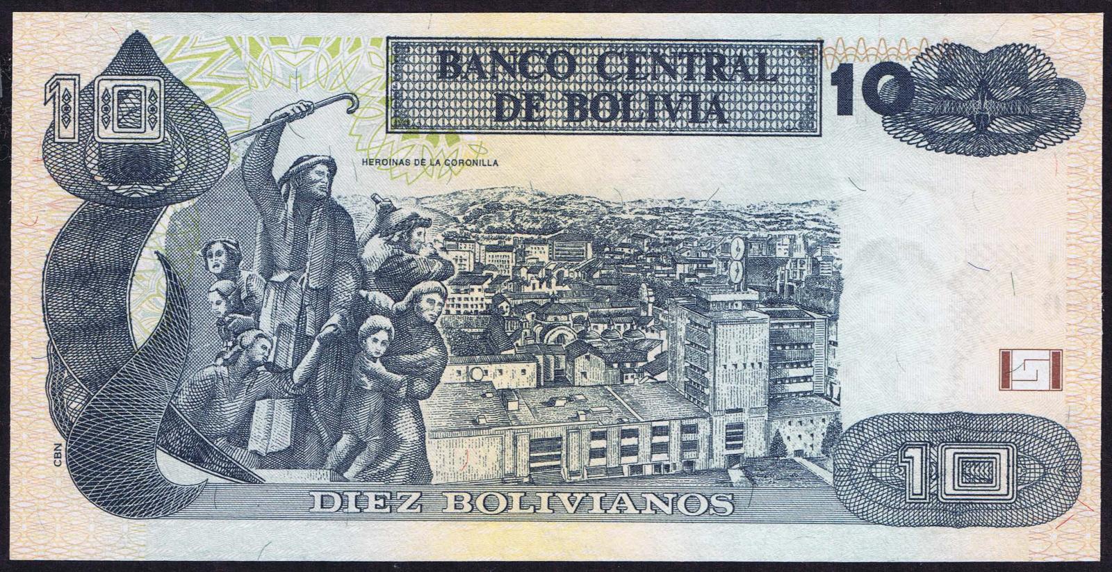 Law of 1962 (1983). Red on multicolored underprint. Underprint with green at let, blue at right. Portrait of Simon Bolivar at right. Red serial number, and security thread at left center. Back darker red; engraved, scene of the declaration of the Bolivian Republic. Back dull red, lithographed with poor detail. Black serial number. Without security thread. Prefixes #10E-13D. 2 Signature varieties.