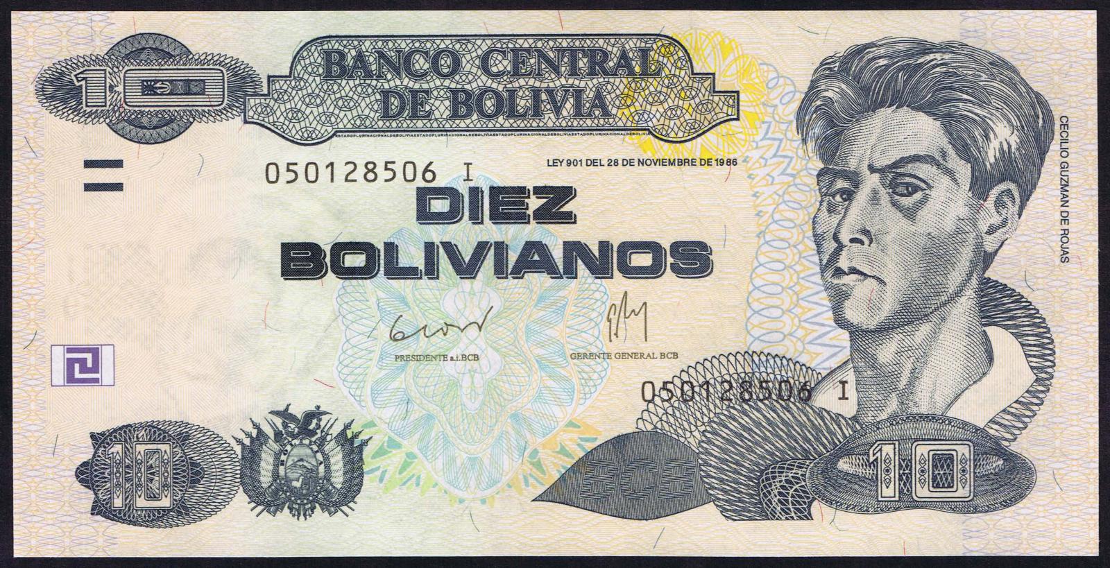 ND (1987). Reddish brown on light blue and light reddish brown underprint. 90 days usage clause at lower right on back. Overprint at right on back: DIEZ CENTAVOS DE BOLIVIANO.