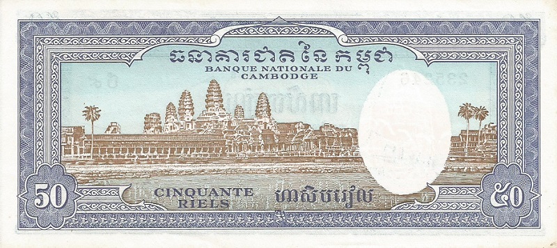 ND (1956-1975). Blue and orange. Fishermen fishing from boats with large nets in Lake Tonie Sap at left and right. Back blue and brown; Angkor Wat. Watermark: buddha. Printer: TDLR (without imprint). Cambodian numerals in plate block designator. Six digit serial number.
