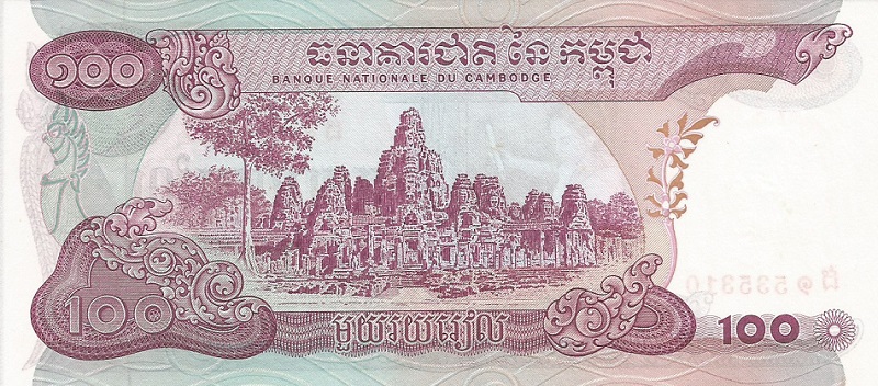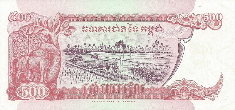 1998. Red and purple on multicolored underprint. Angkor Wat at right. Mythical animal at left, rice fields at center on back. Arms at upper left on face. Watermark: stylized lotus flowers. Printer NBC.