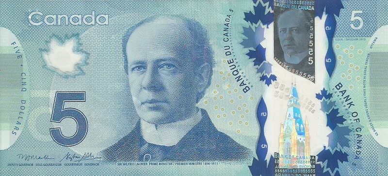 2013. Polymer plastic. Light and dark blue on multicolored underprint. Sir Wilfred Laurier and west block of Parliament Building on face. Back: Canadarm2 at right center.