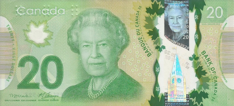 1973. Black on light green and multicolored underprint. Queen Elizabeth II at right. Parliament Building as seen from across the Ottawa River on back.