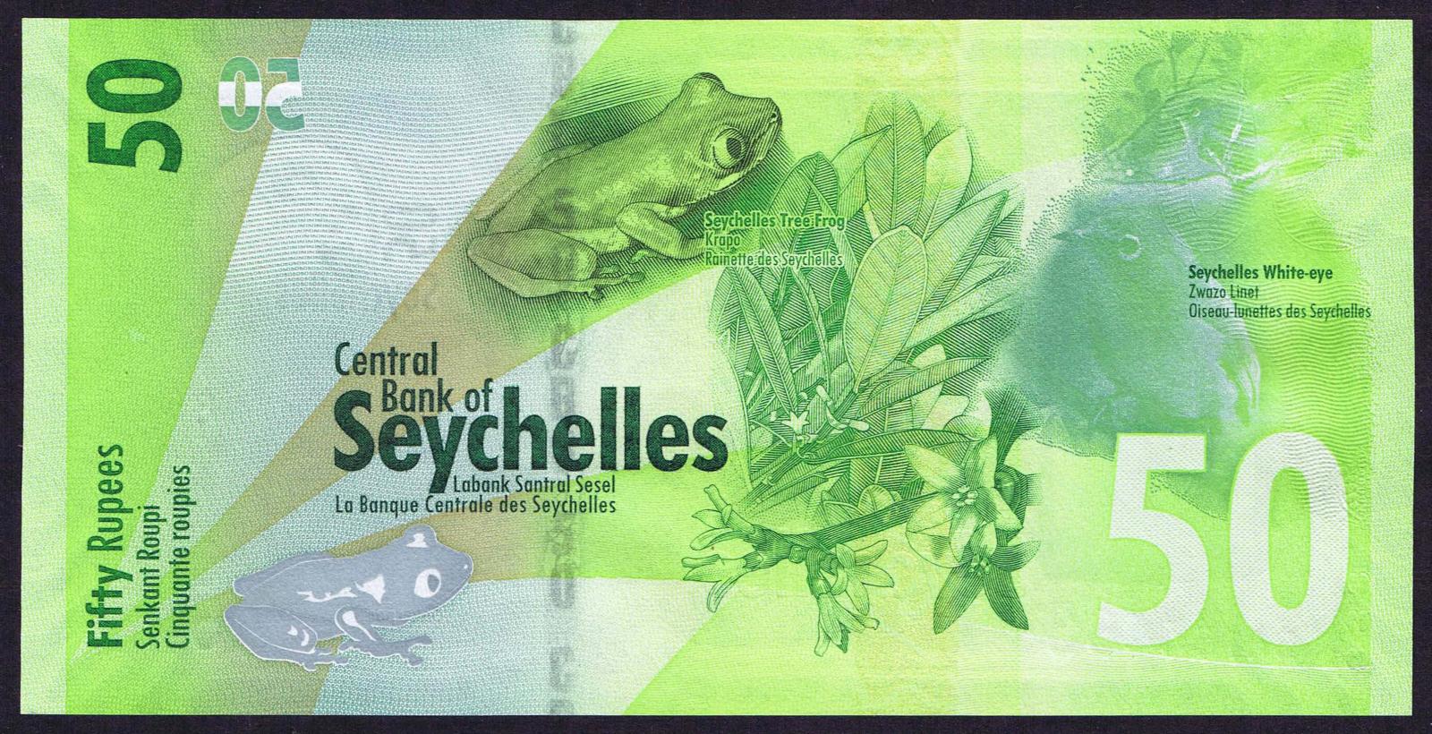 2016. Green on green and yellow underprint. Seychelles black parrot at center on face. Back of the banknote features a Seychelles tree frog at top center, and a Seychelles white-eye bird at right.