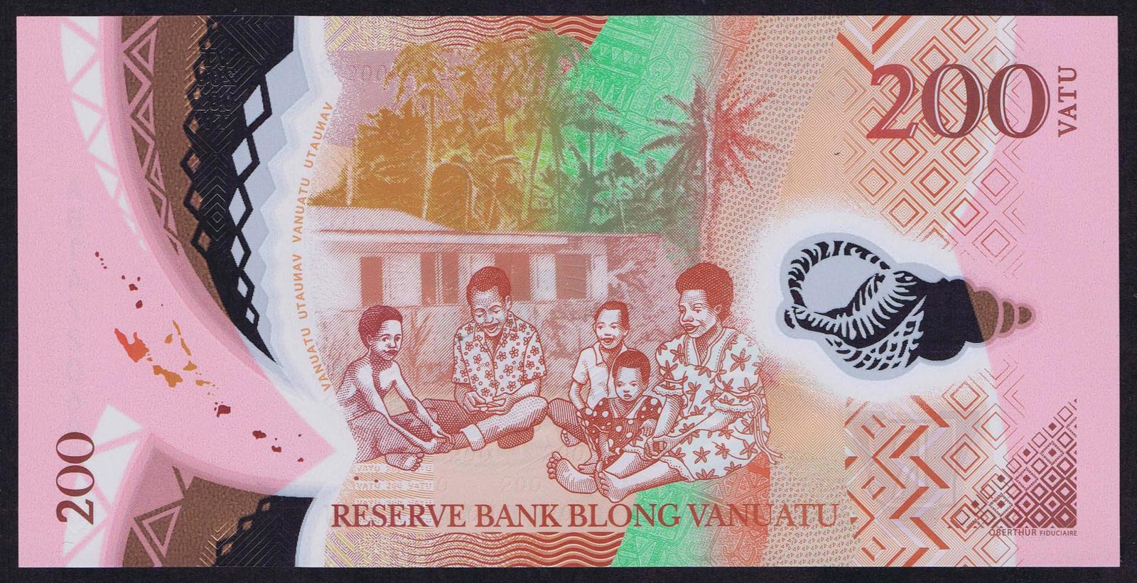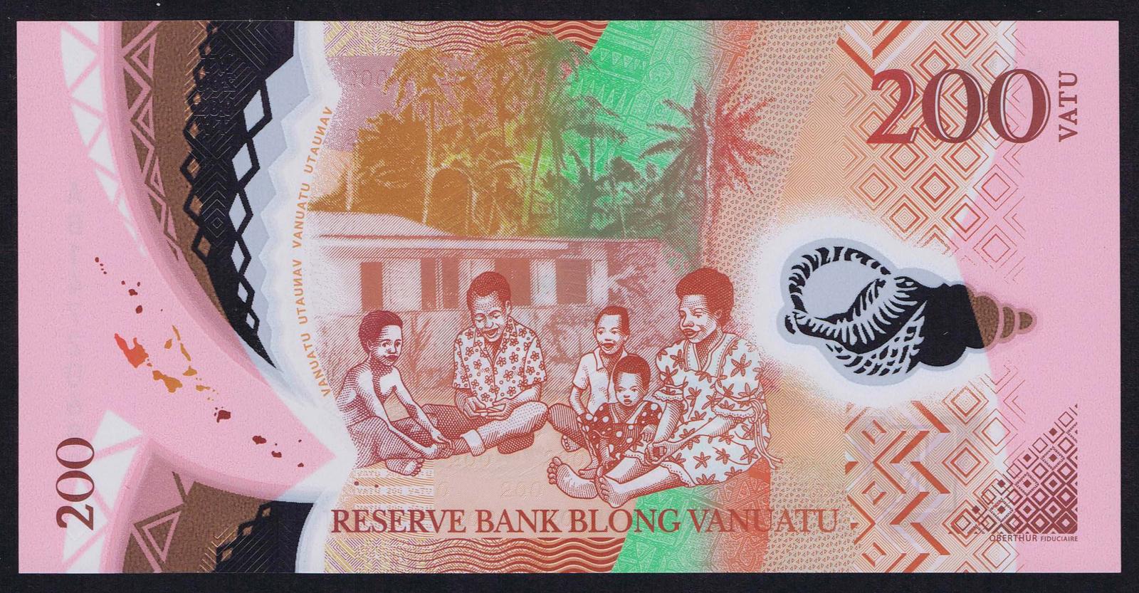 2014. Polymer plastic. Pink, brown, blue and green. Conch shell, waterway, Malanesian chief holding a spear. Map. Back: map of Vanuatu islands, family of five seated outside of house with palm trees. Printer: Oberthur.