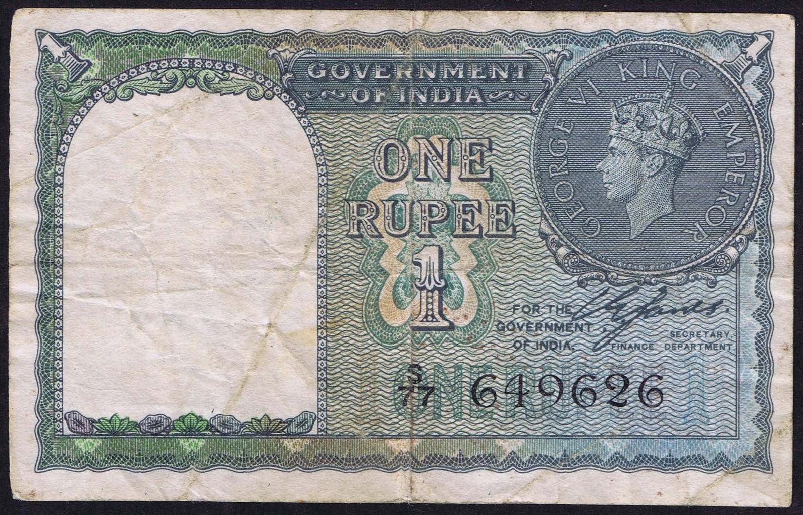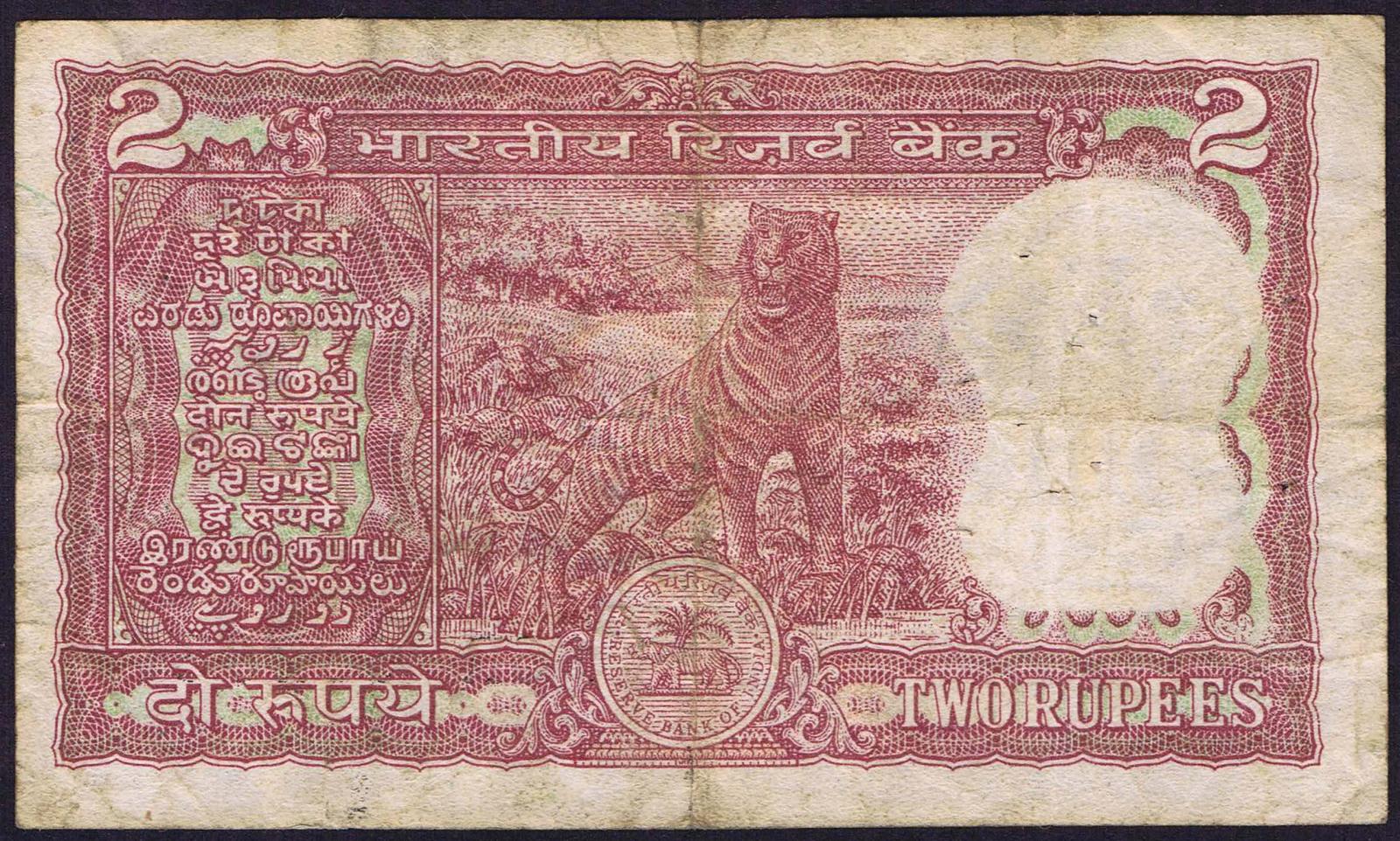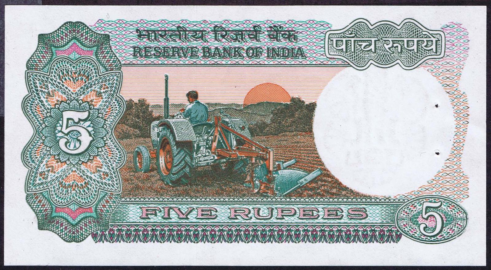ND (1975). Grayish green on light blue and orange underprint. Large letters in underprint beneath serial number. Asoka column at right and as watermark. Farmer plowing with tractor at center on back. With letter B.
