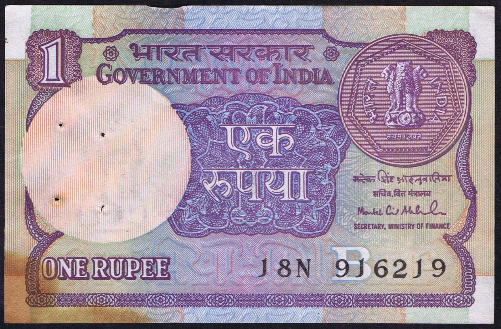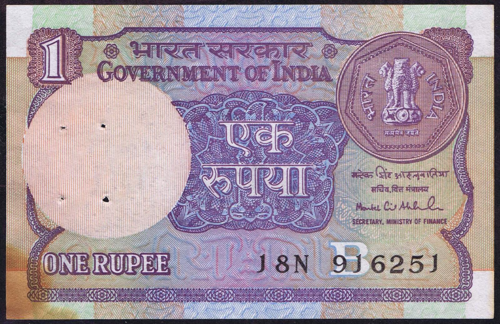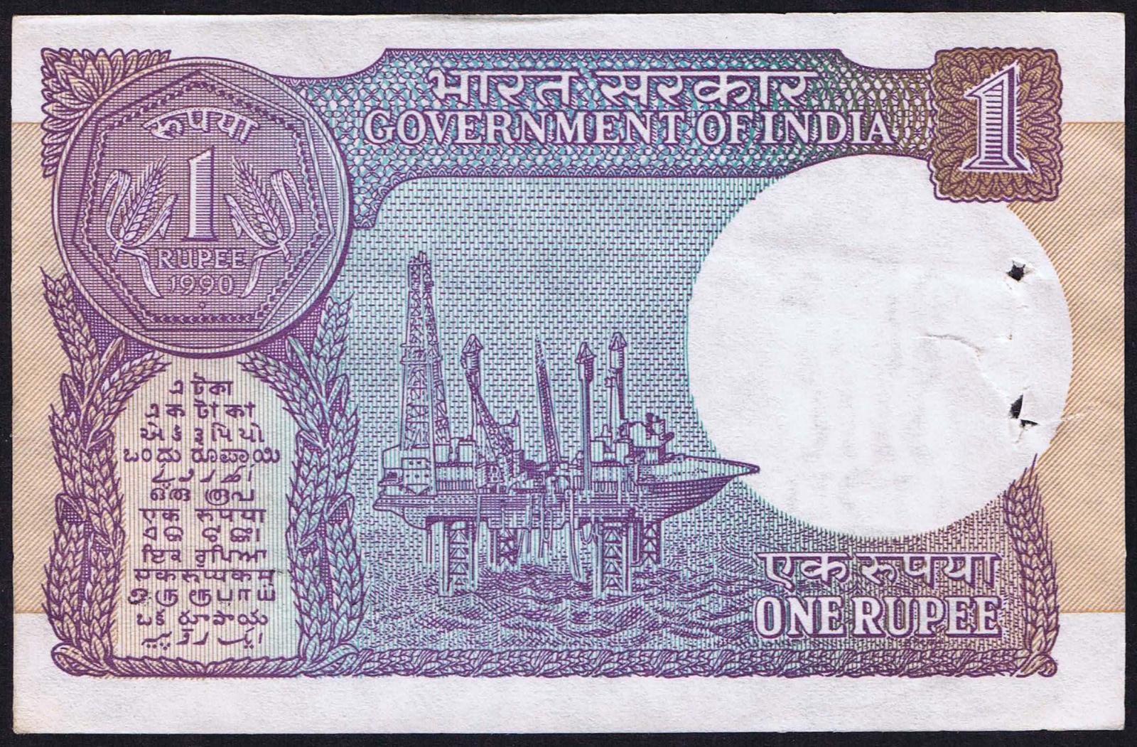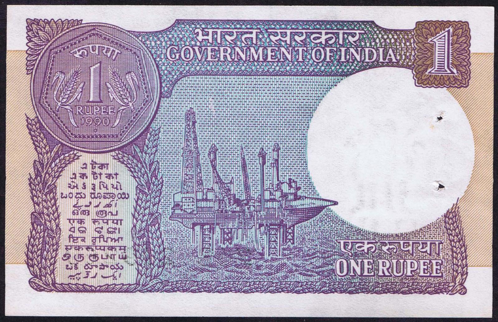1990. Violet and purple on brown and multicolored underprint. New coin design with Asoka column at upper right. Offshore oil drilling platform and reverse of coin with date on back. Watermark: Asoka column. Letter B.