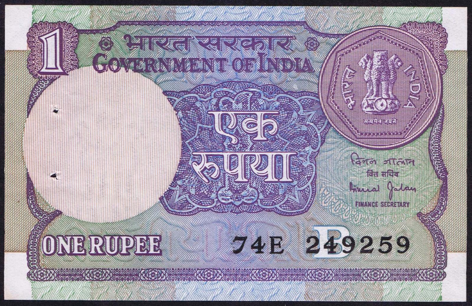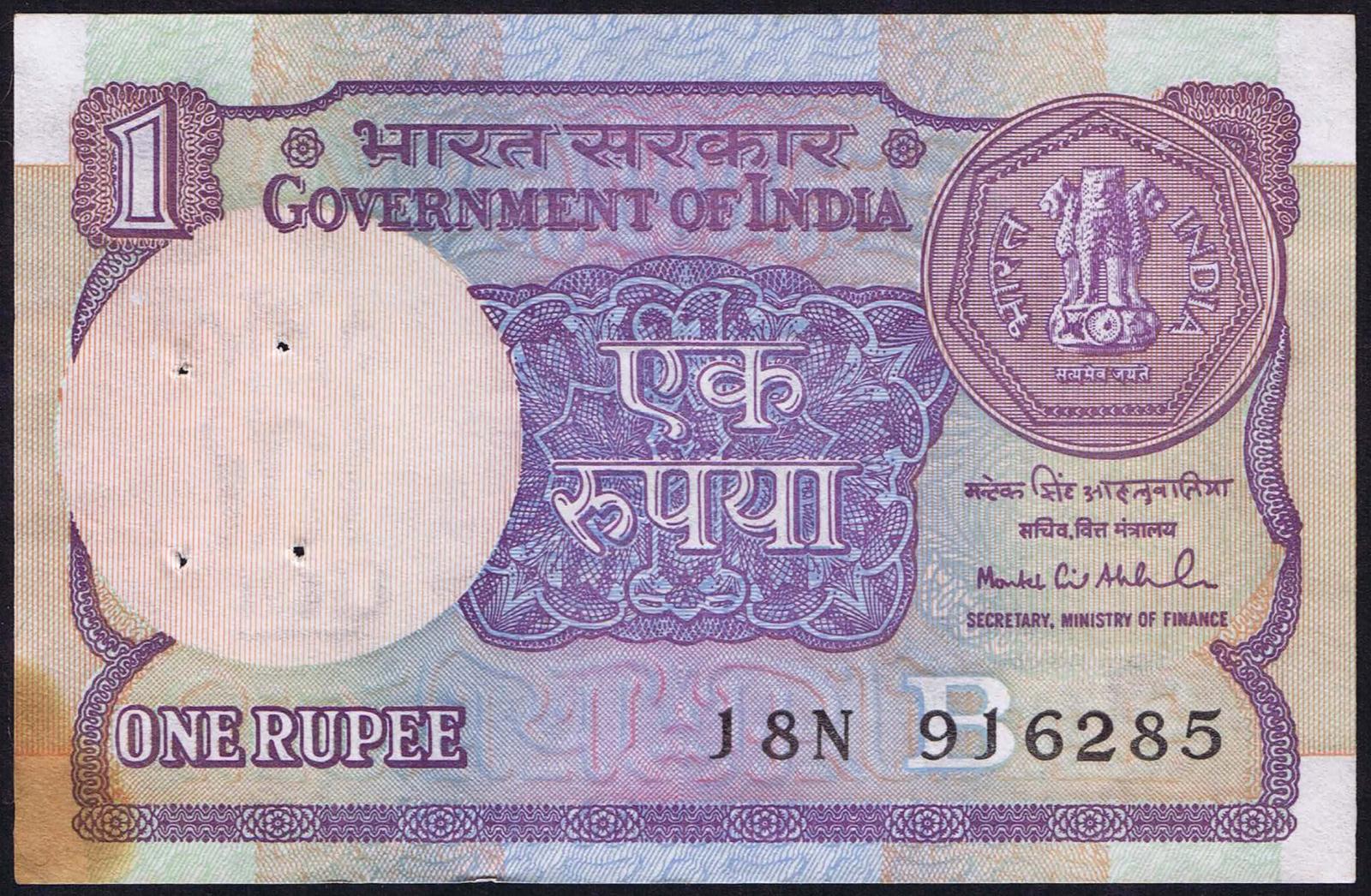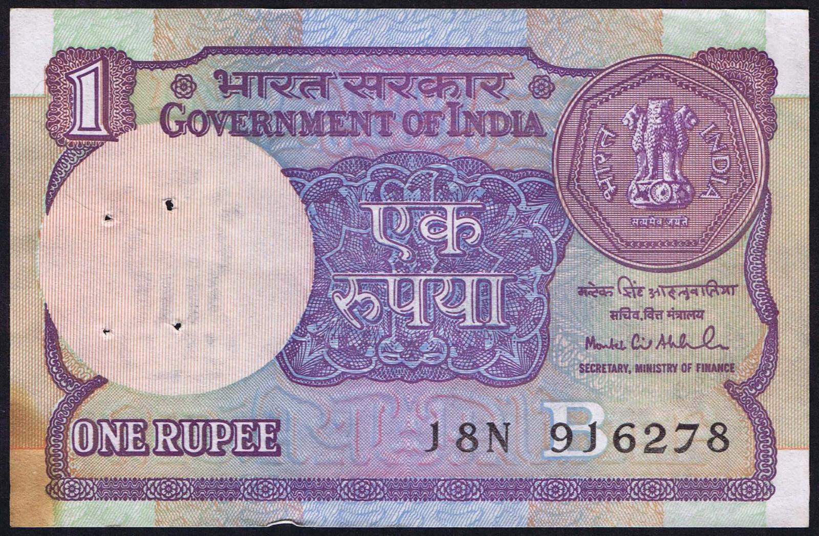1990. Violet and purple on brown and multicolored underprint. New coin design with Asoka column at upper right. Offshore oil drilling platform and reverse of coin with date on back. Watermark: Asoka column. Letter B.