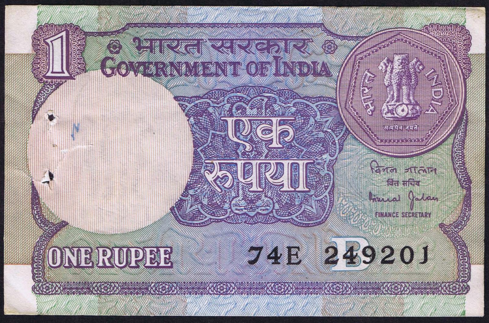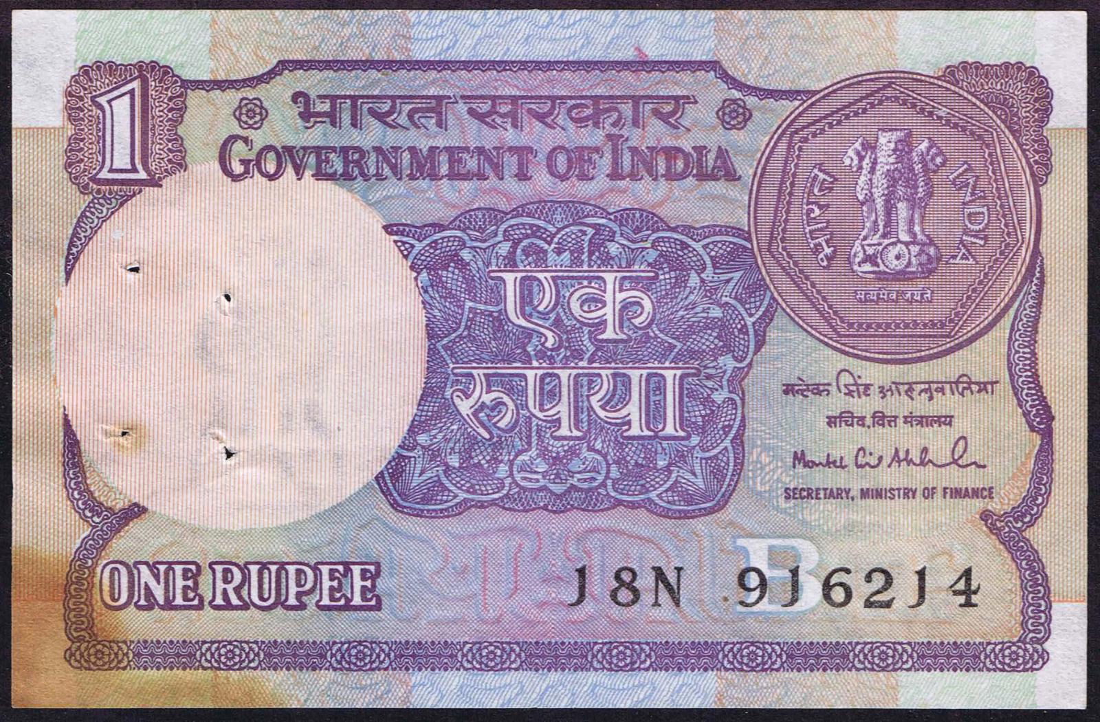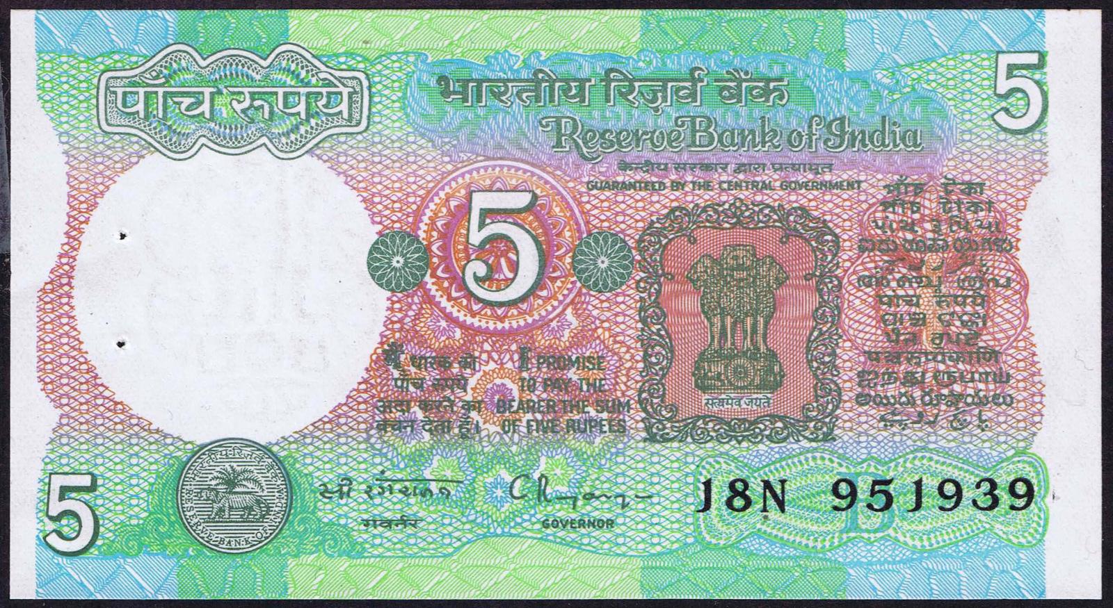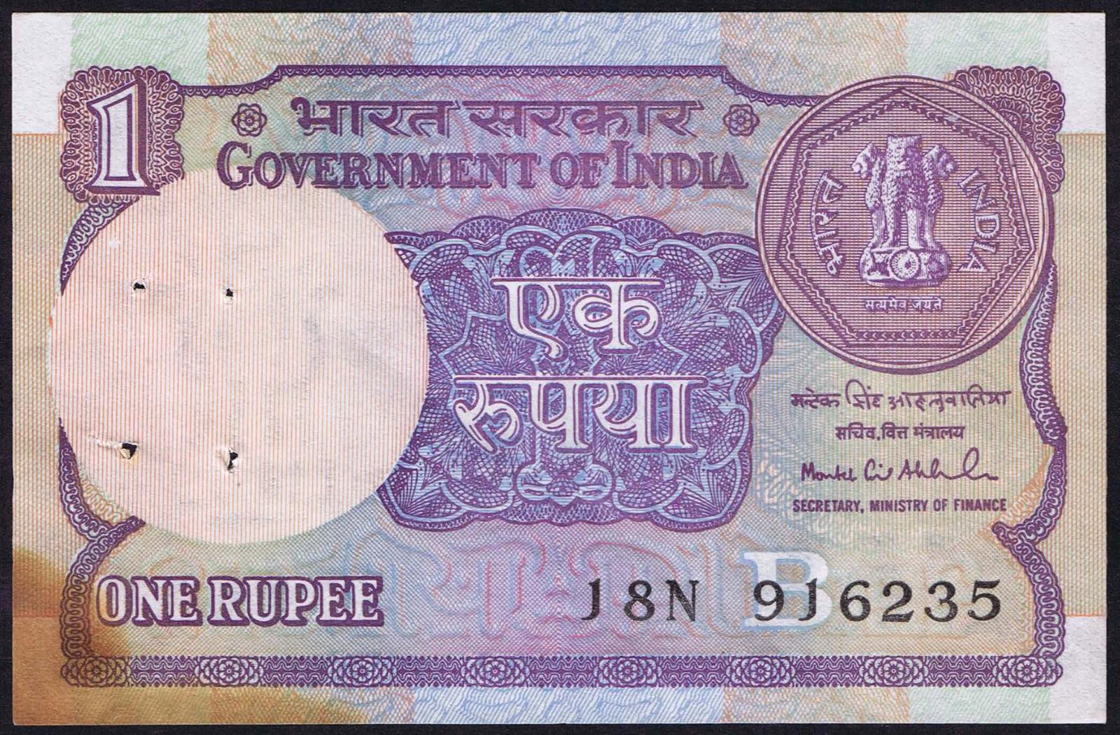 1990. Violet and purple on brown and multicolored underprint. New coin design with Asoka column at upper right. Offshore oil drilling platform and reverse of coin with date on back. Watermark: Asoka column. Letter B.