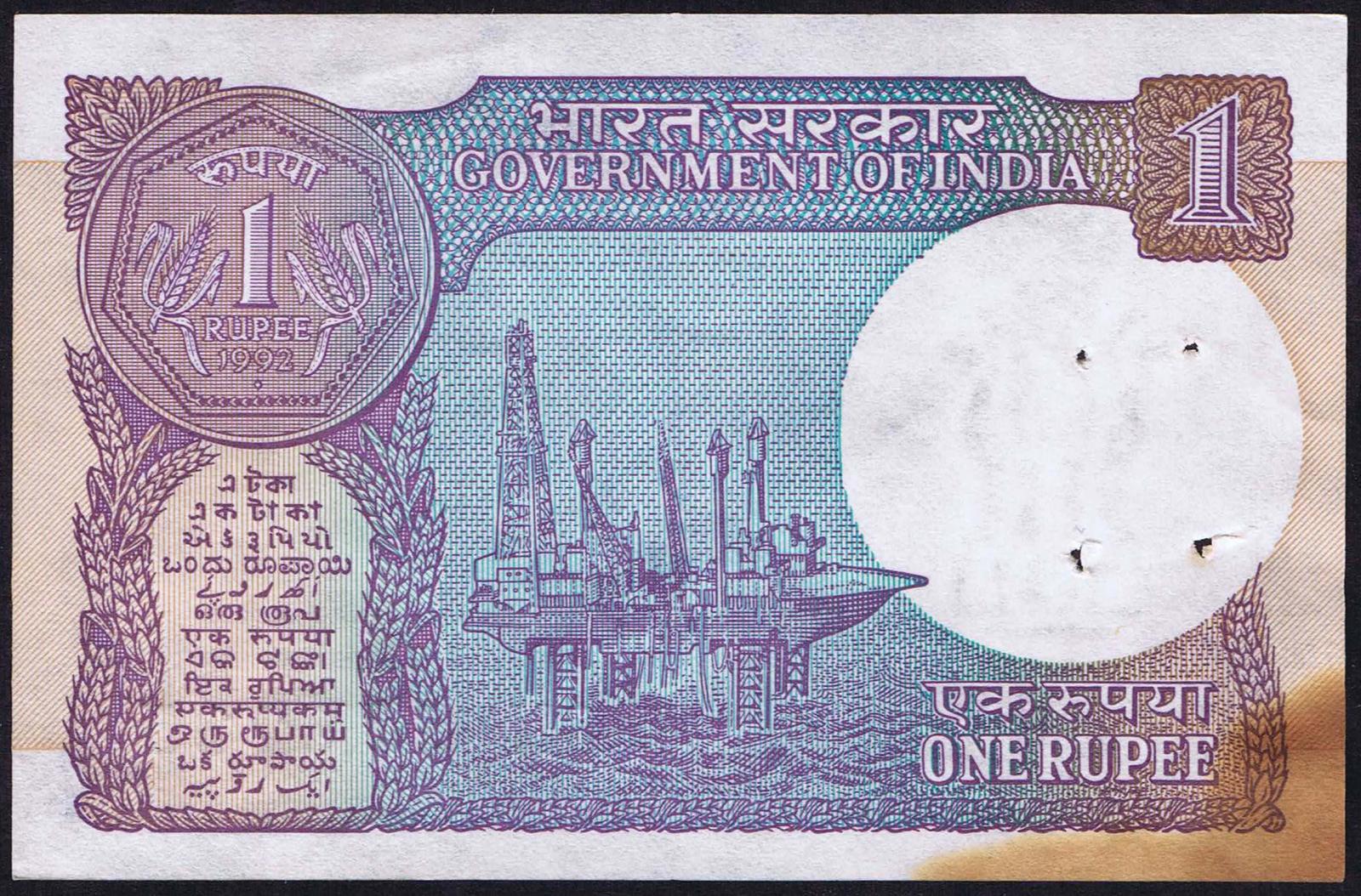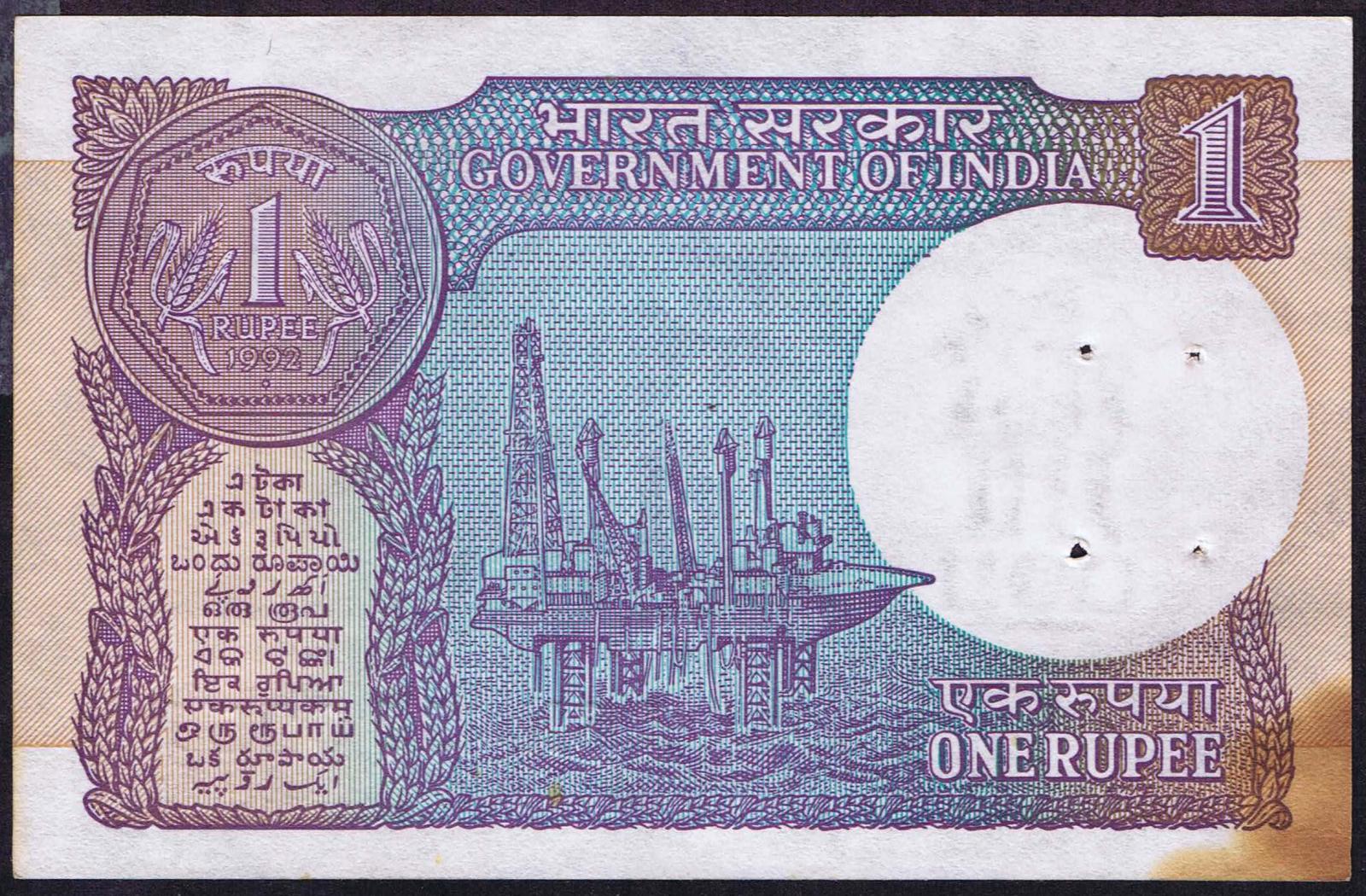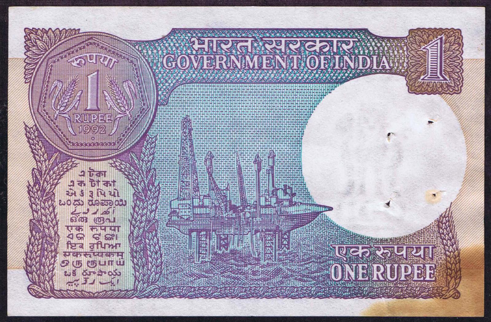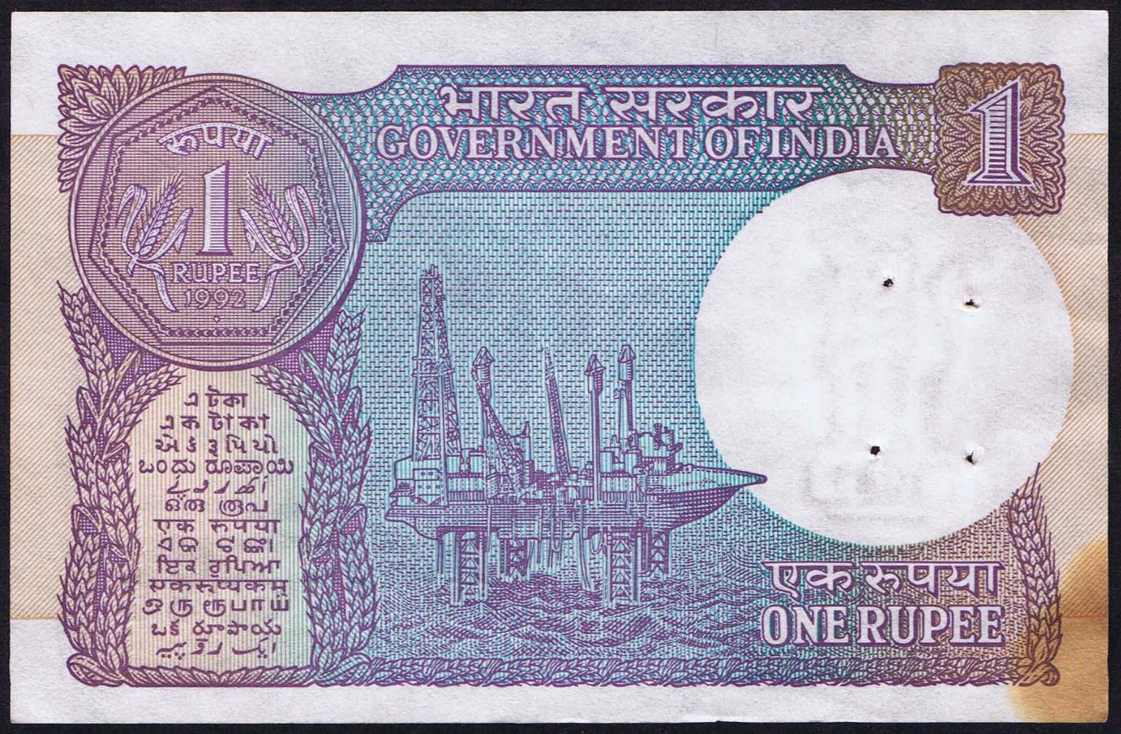 1992. Violet and purple on brown and multicolored underprint. New coin design with Asoka column at upper right. Offshore oil drilling platform and reverse of coin with date on back. Watermark: Asoka column. Letter B.