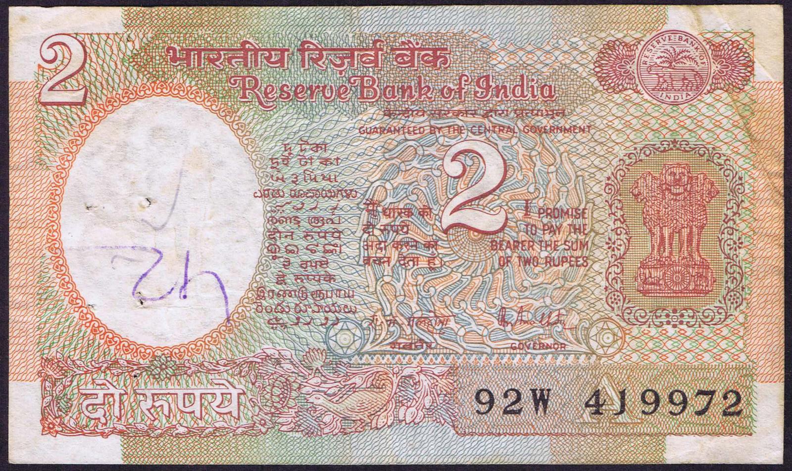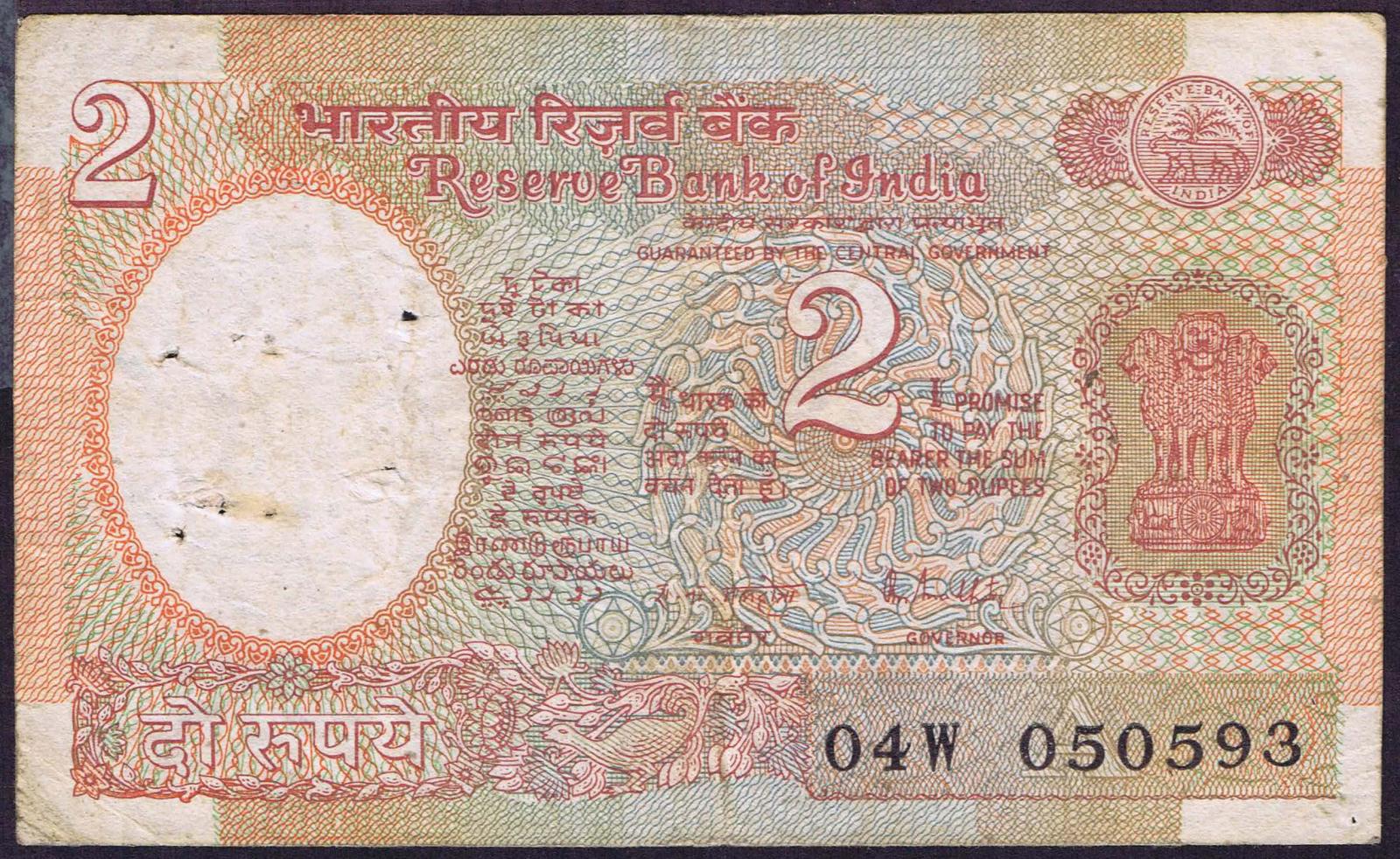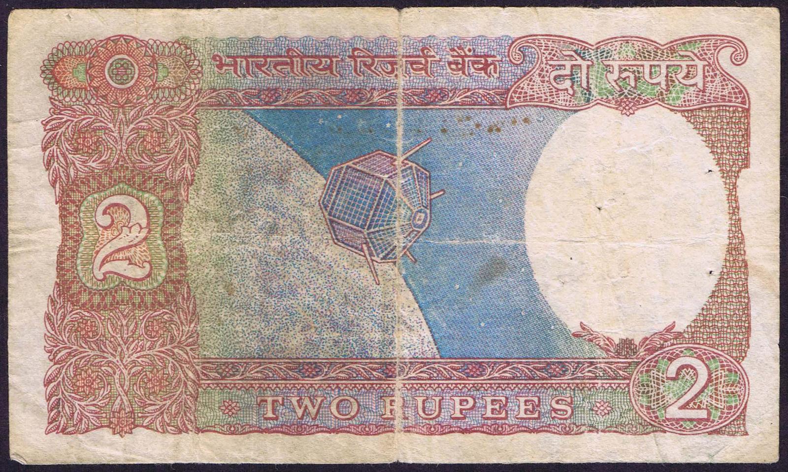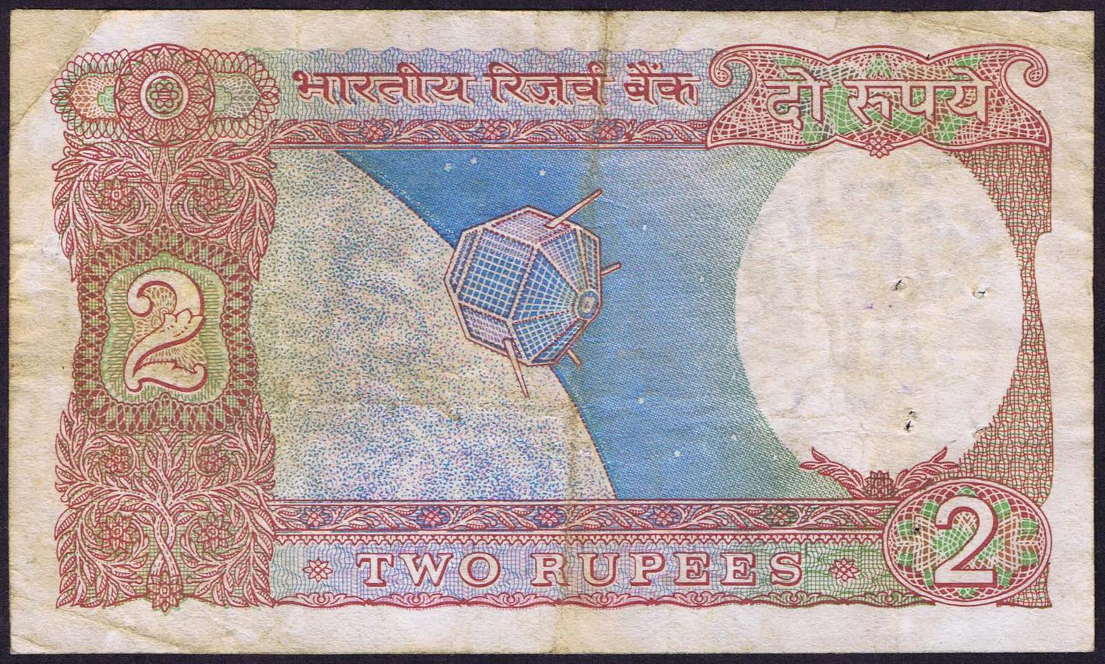 ND (1976). Orange on multicolored underprint. Asoka column at right and as watermark. Large letters in underprint beneath serial number. Space craft at center on back. Letter A.