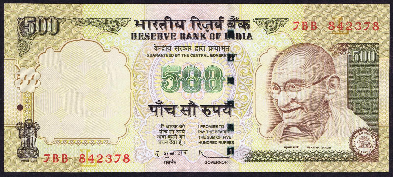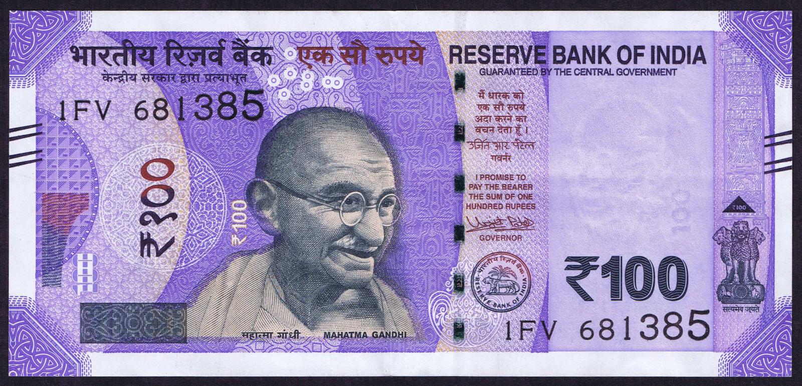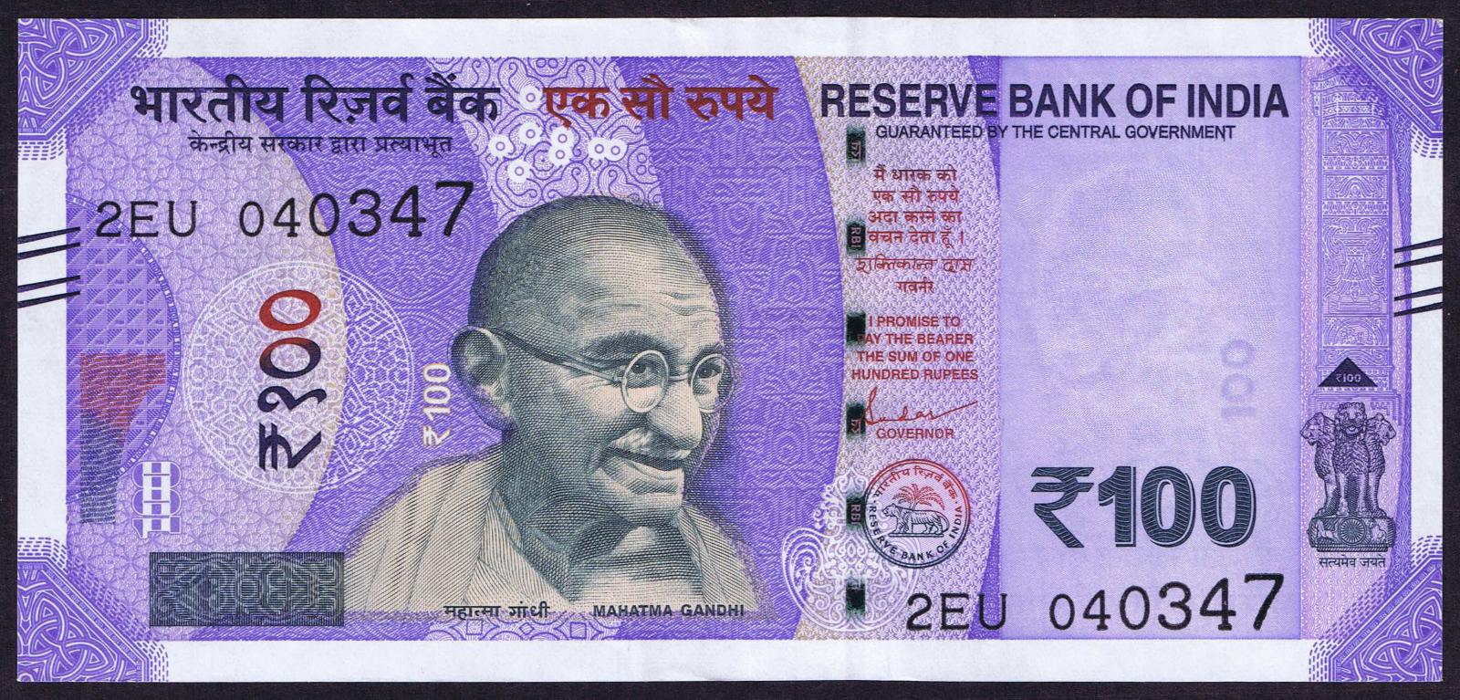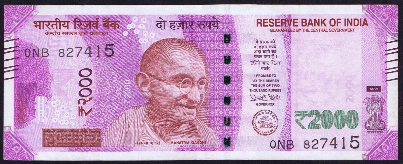 2017. Violet and purple brown. Mahatma Ghandi at left center. Ashoka Pillar at right. Windowed security thread. Marks for the blind. Back: motif of Mangalyaan. No letter in underprint.