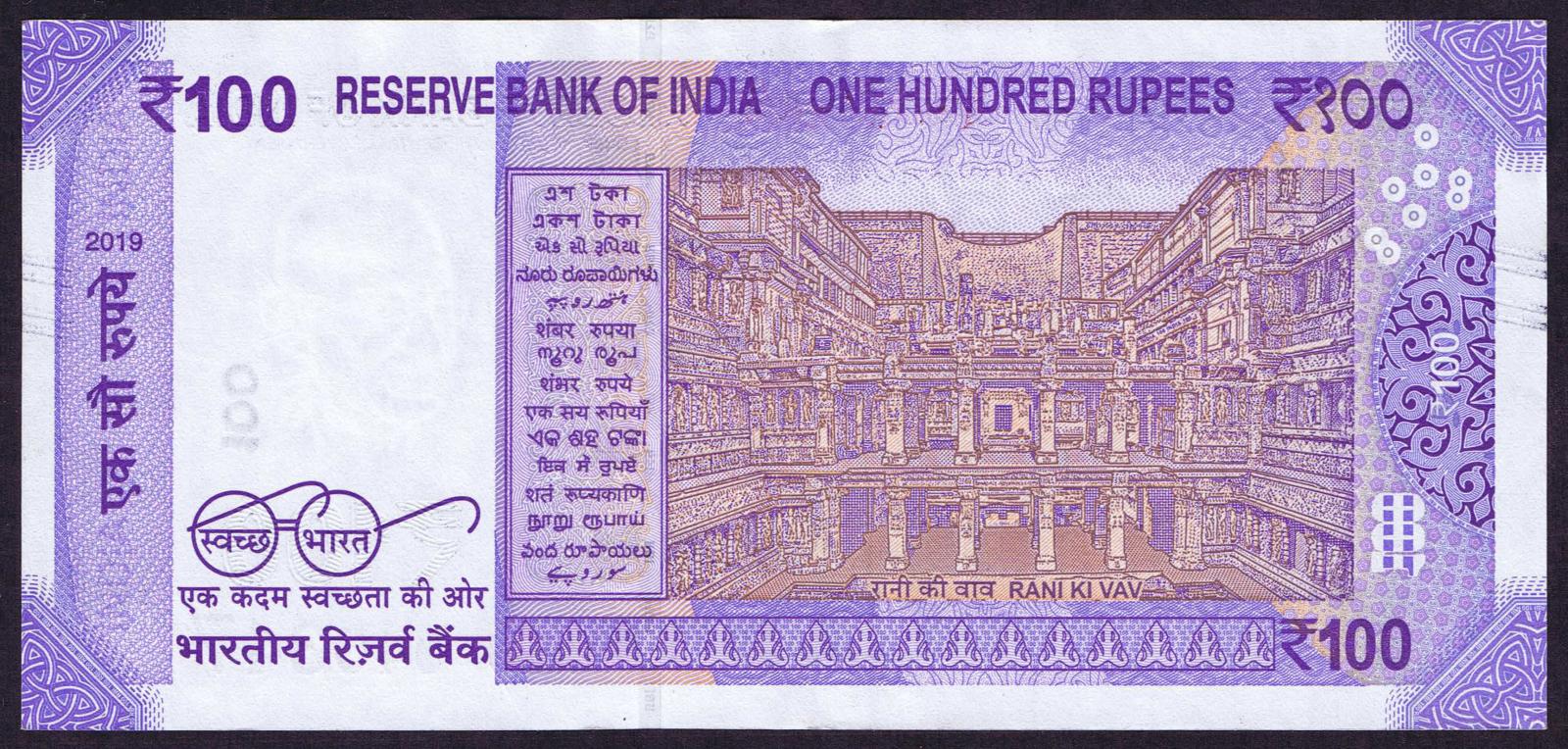 2019. Slate grey on purple underprint. Mahatma Ghandi at left center. Ashoka Pillar at bottom right. Marks for the blind on right edge. Three storey structure on back. Without a letter in the underprint.