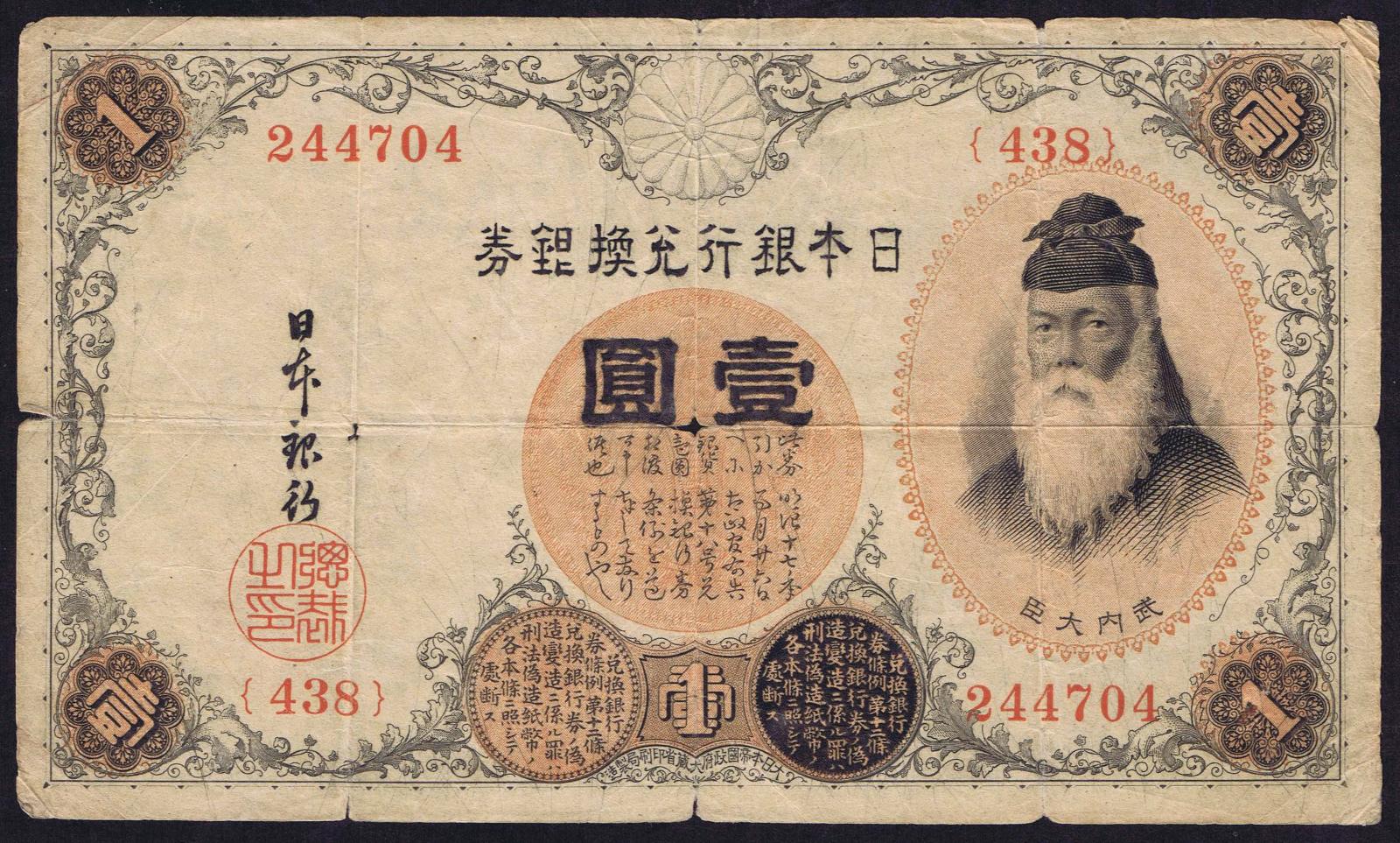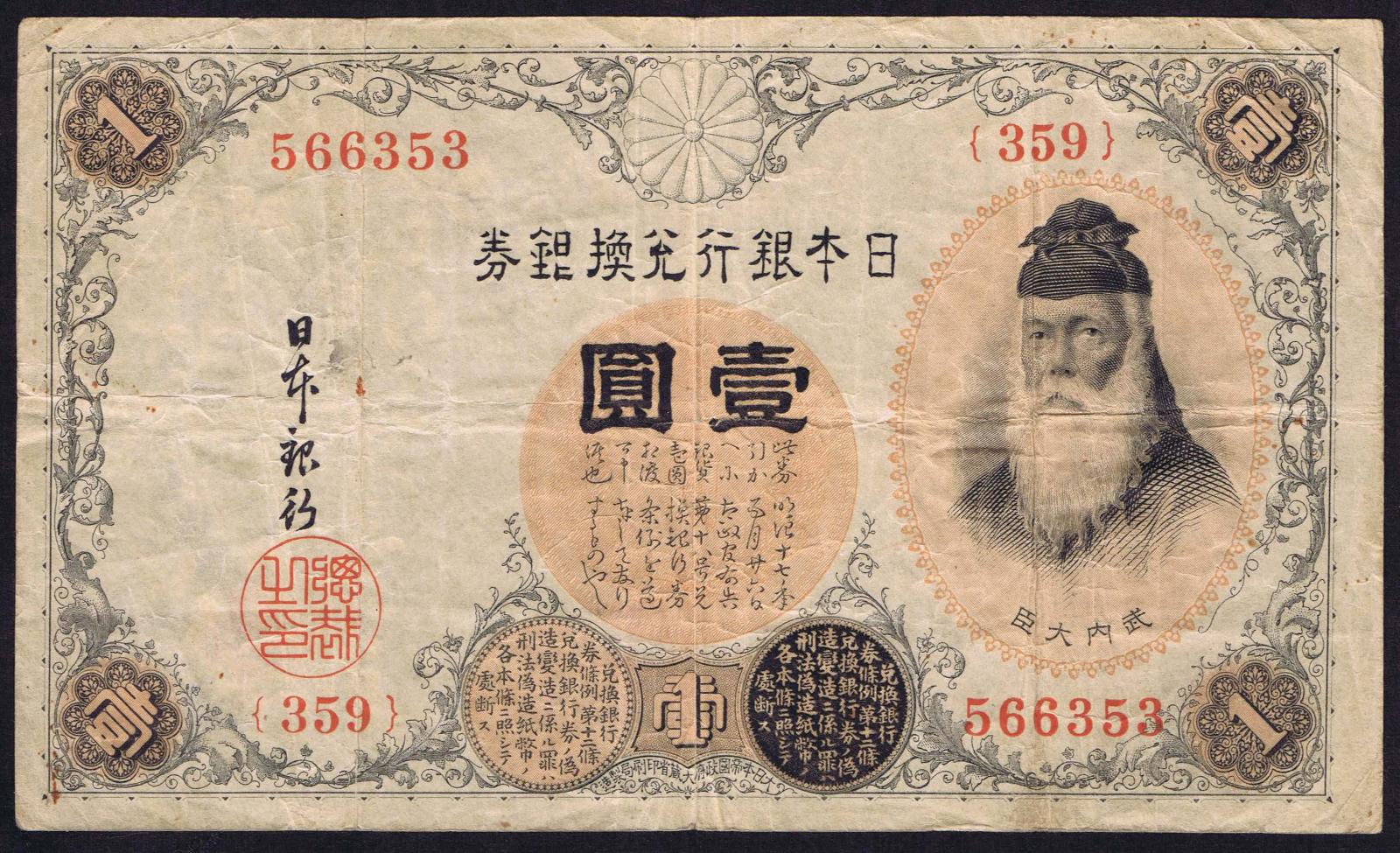 ND (1916). Black on light orange underprint. Portrait p1 at right with Western serial number. Back: 1 yen coin at center and left. Block number 300 and higher.