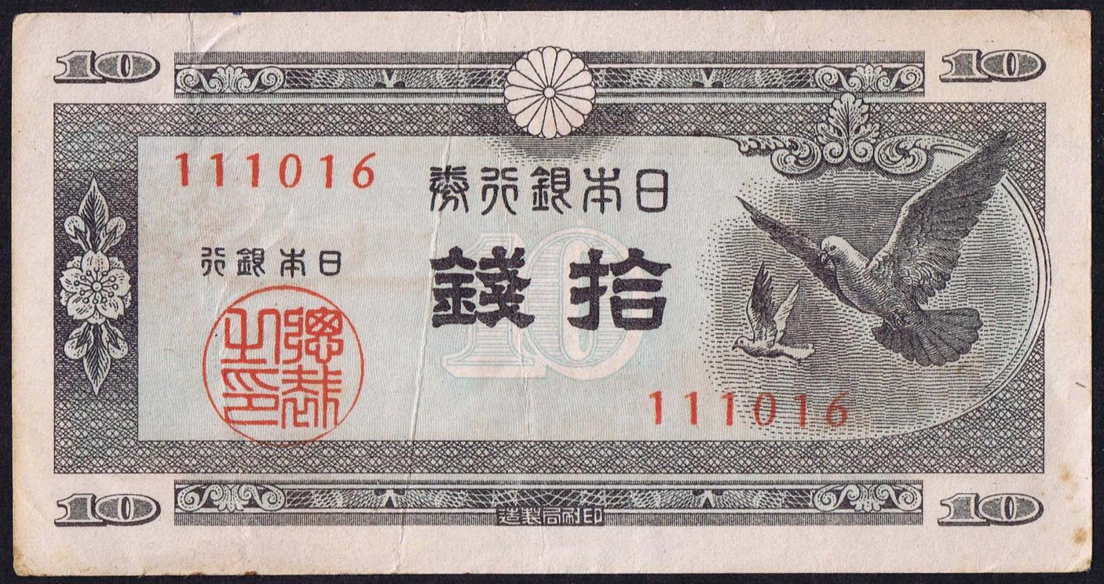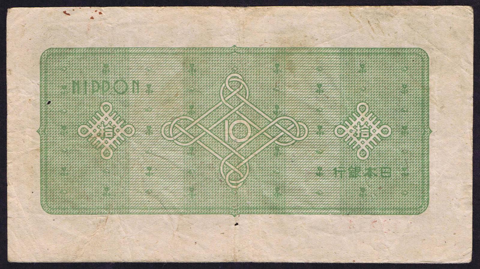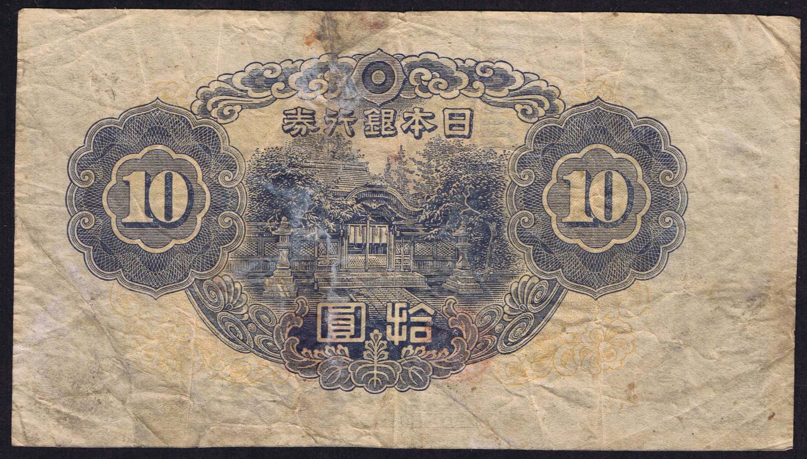 (1943). Black on brown and light blue underprint. Portrait p3 at right. Black serial number and block number. Japanese text only. Back: Blue. Goo Shrine at center. Watermark: 10 Yen in Japanese characters at top center.