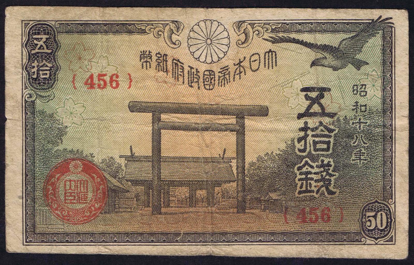 1942-1944. Black on green and brown underprint. Yasukuni Shrine. Back: Green. Mountain at center. Showa yr. 18 (middle and second from bottom characters in text at very right are 十八).