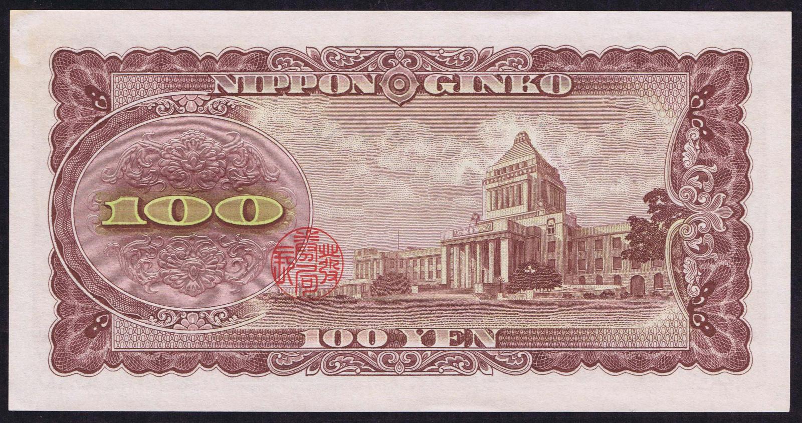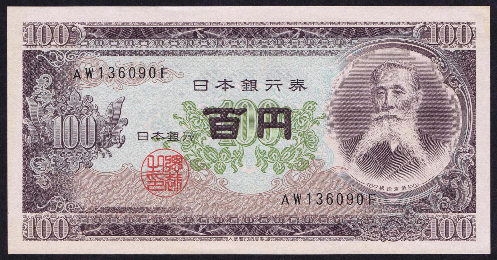 ND (1953). Brown-violet on green and multicolor underprint. Portrait Itagaki Taisuke at right. Back: Diet building at right. 12 varieties exist. Double letter serial number prefix. White paper.