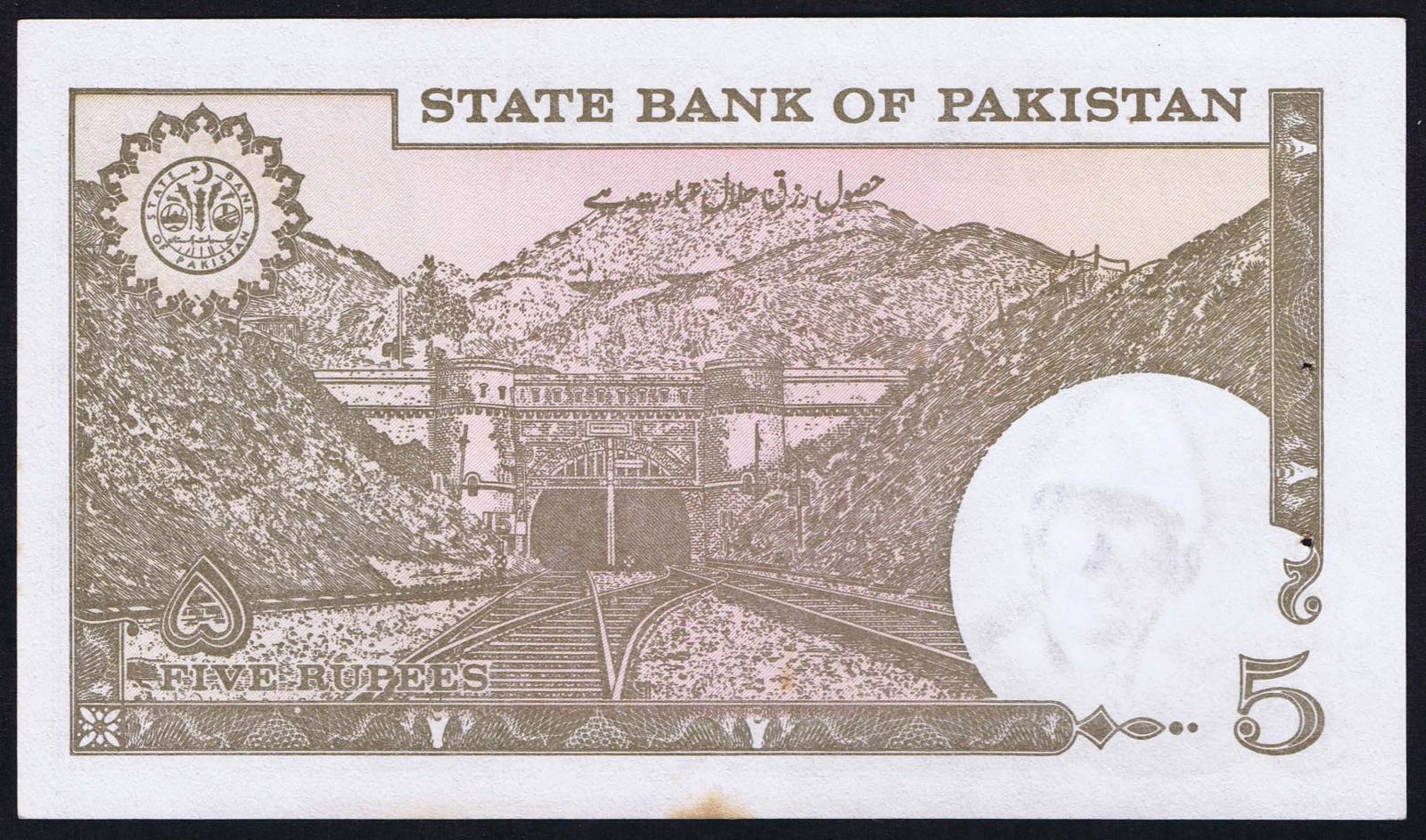 ND (1983-1984). Dark brown on tan and pink underprint. Mohammed Ali Jinnah at right. Six signature varieties. Back: Khajak railroad tunnel. Urdu text line B beneath upper title. Watermark: Mohammed Ali Jinnah.