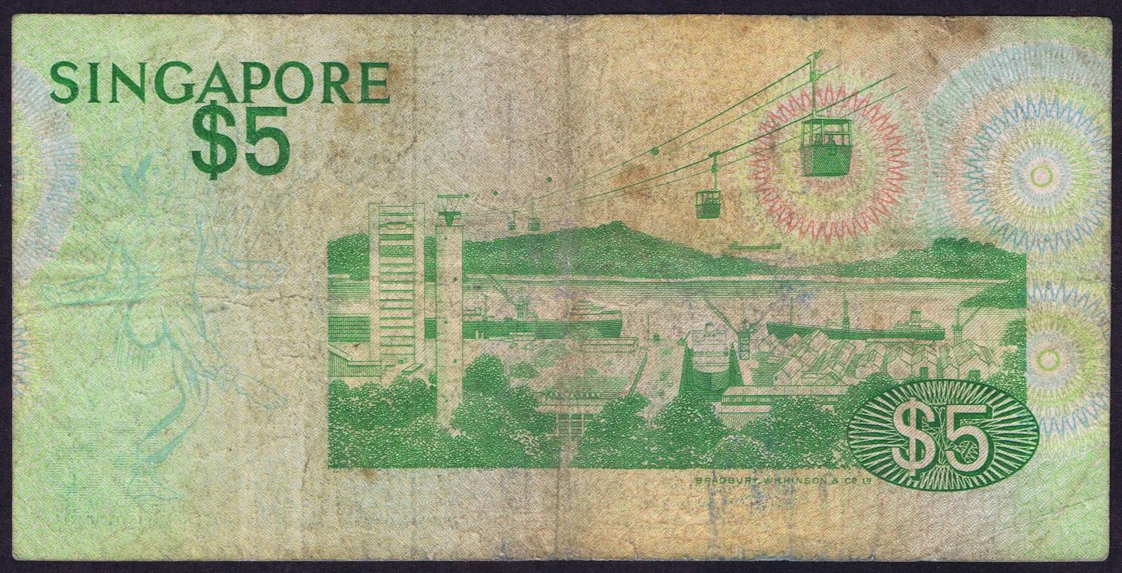 ND (1976). Green and brown on multicolor underprint. Redwhiskered bulbul at left, city skyline along bottom, arms at upper right. Back: Ariel tram cars and view of harbor. Watermark: Lion's head. Printer: BWC.