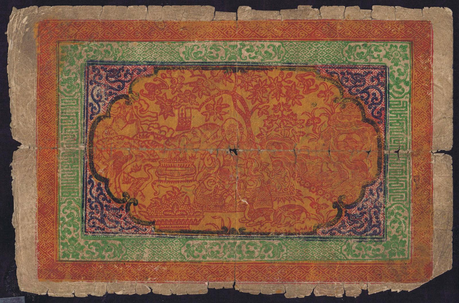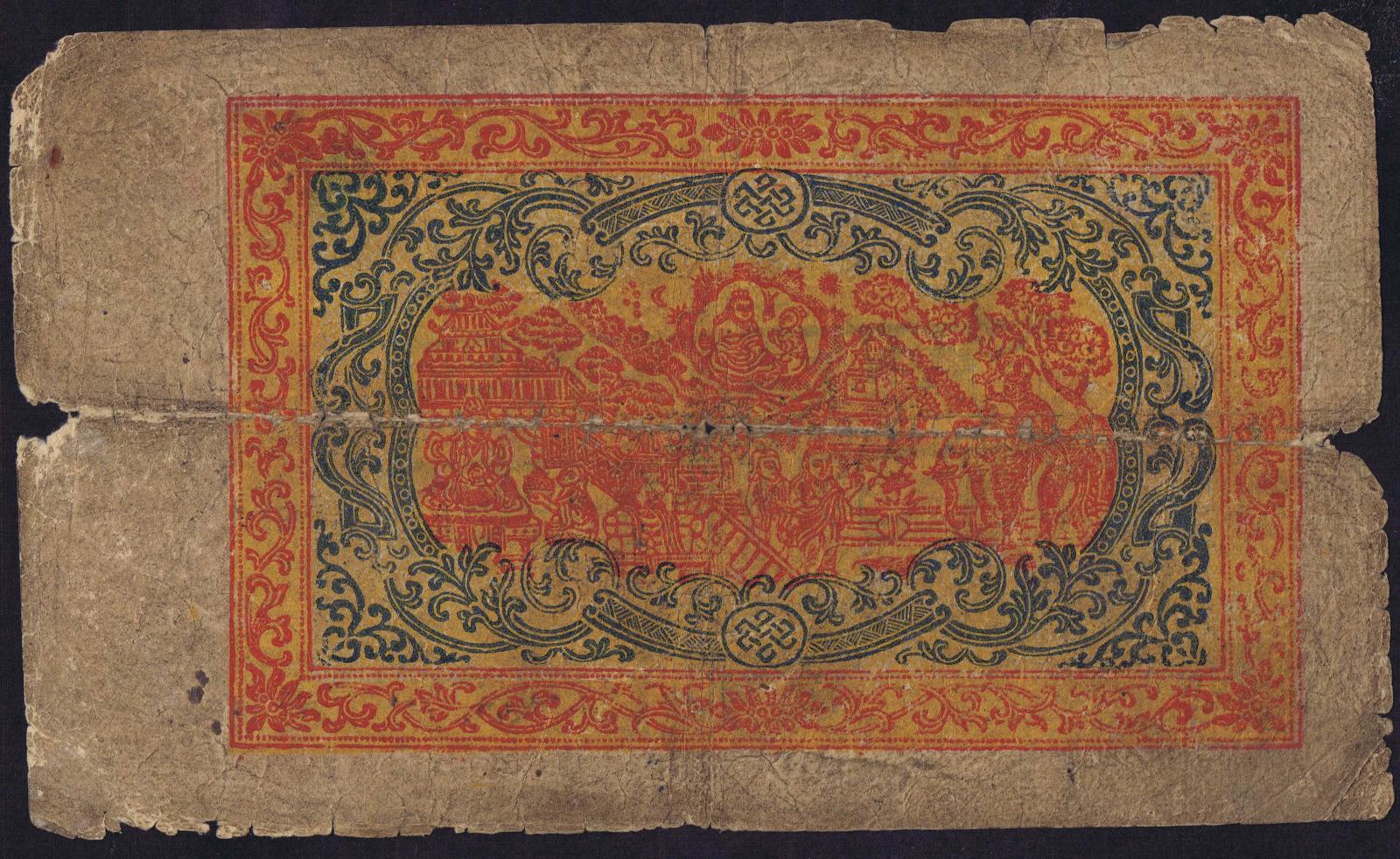 1687-1694 (1941-1948). Blue on pink underprint. Two lions at center. Four lines of text. Back: dragons and lions. These notes were made by pasting together three sheets, the middle one having a two line security legend printed on it.