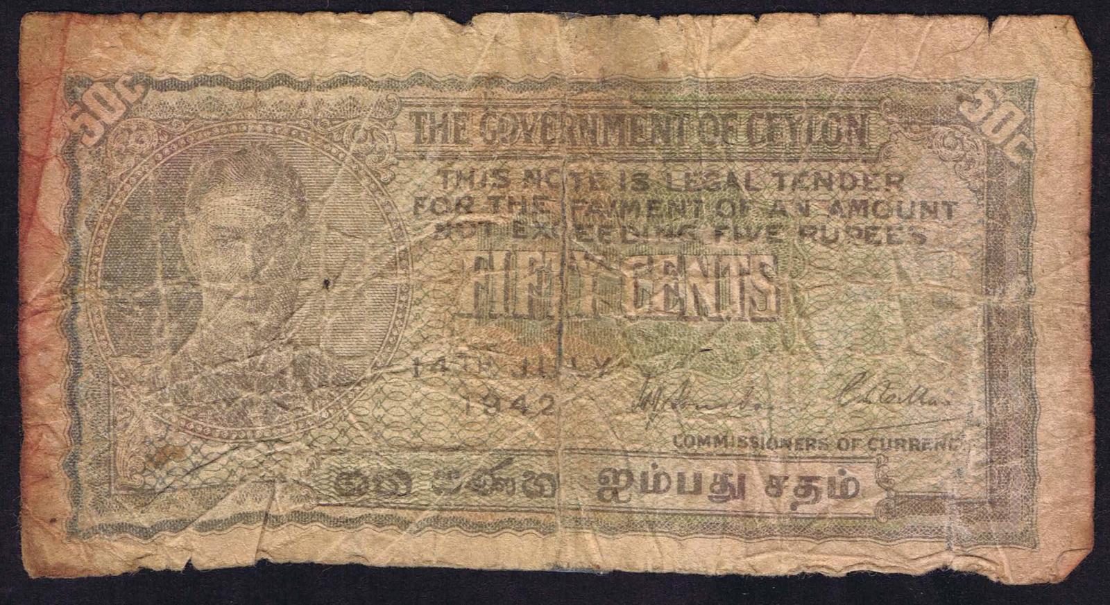 Ceylon pick 45a: 50 Cents from 1942