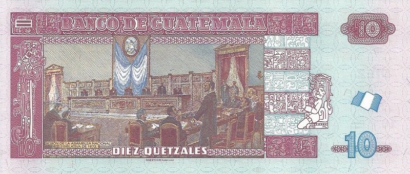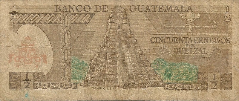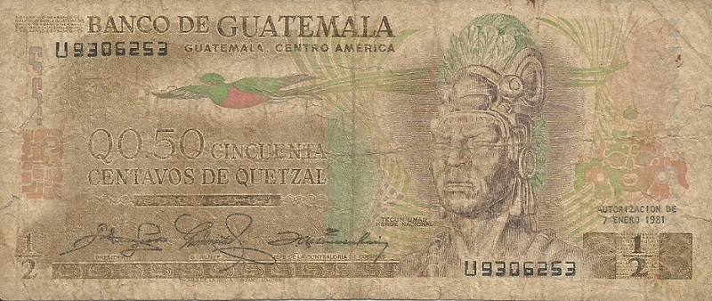 4.1.1978; 3.1.1979; 2.1.1980; 7.1.1981; 6.1.1982; 6.1.1983. Brown on multicolored underprint. Quetzal bird at upper center. Tecun Uman (national hero) at right. Tikal temple on back. Printer: TDLR. Watermark: Tecun Uman. With a fluorescent security imprint on back.