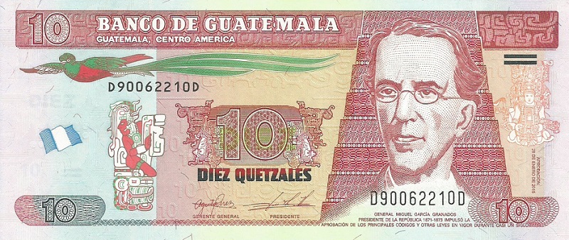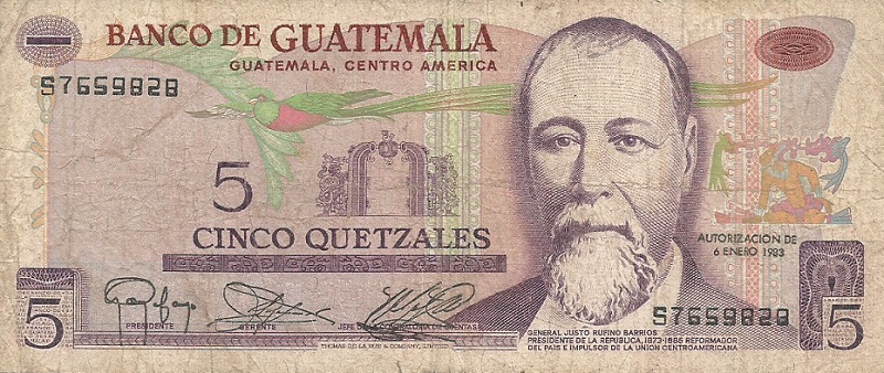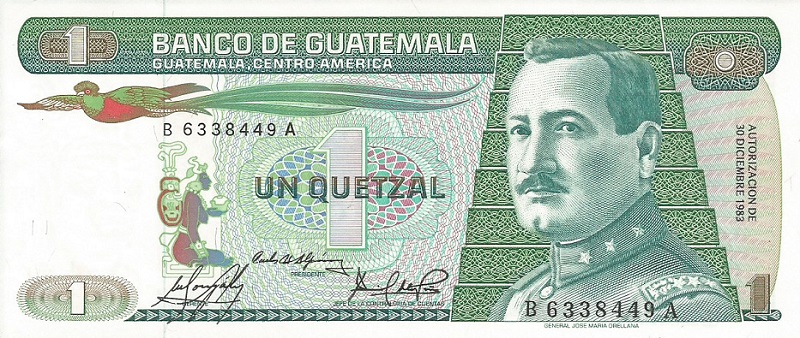 30.12.1983-4.1.1989. Green on multicolored underprint. Quetzal bird at upper center on face. General J. M. Oreliana at right. Banco do Guatemala building on back. Printer: G&D. Watermark: Tecun Uman. Fluorescent security imprint on face. Date at lower right.