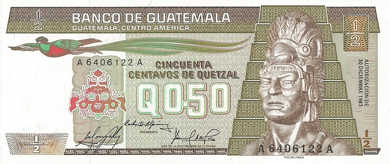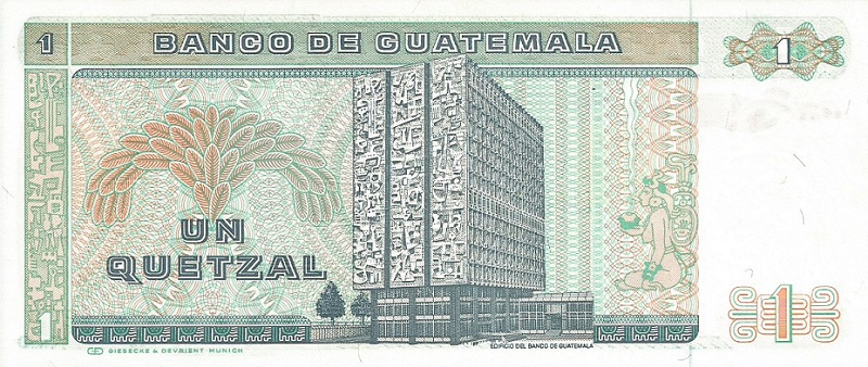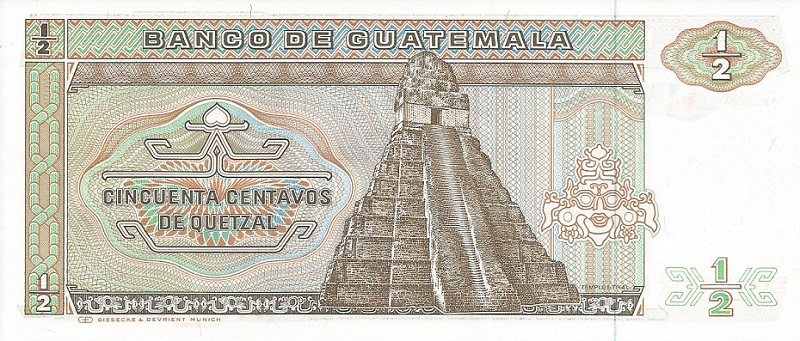 6.1.1983-4.1.1989. Brown on multicolored underprint. Quetzal bird at upper center. Tecun Uman (national hero) at right. Tikal temple on back. Printer: G&D. Watermark: Tecun Uman. With a fluorescent security imprint on back.