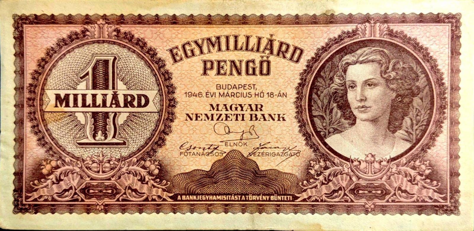 18.3.1946. 1 Milliard Pengö. Violet on light orange underprint. Portrait woman at right.