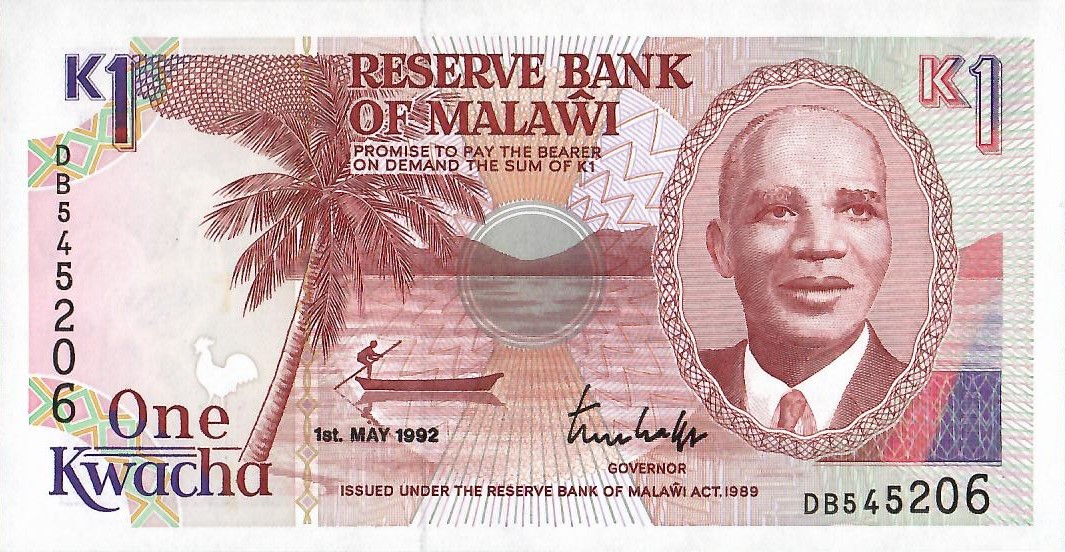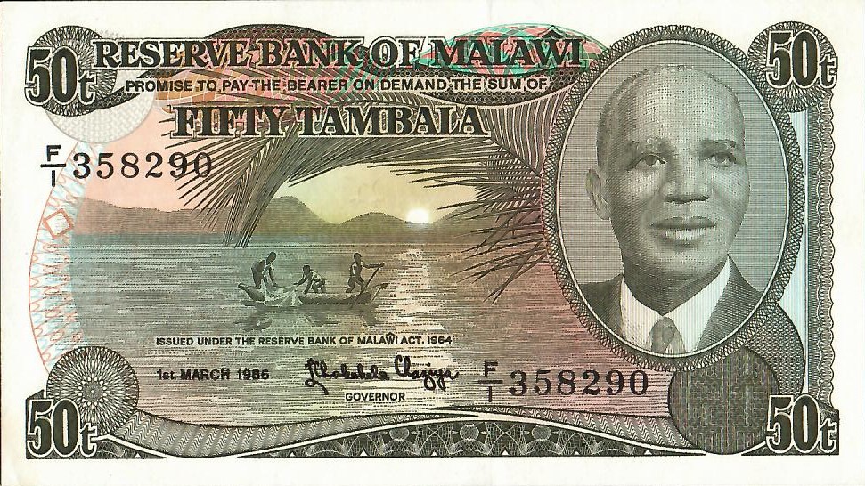 1.5.1992. Red-brown on multicolored underprint. Palm tree, man in dugout canoe, and rayed silver circle at center, portrait of Dr. Hastings Kamuzu Banda as president at right. Cultivating tobacco on back. Ascending size vertical serial number at left and lower right. Watermark: rooster.