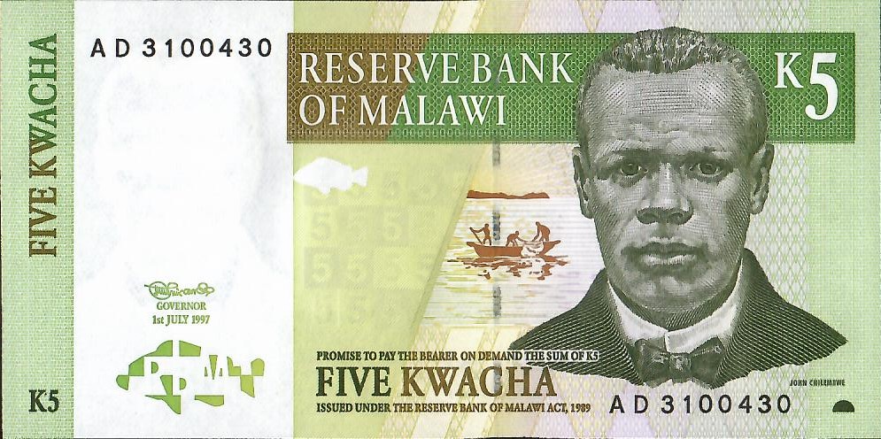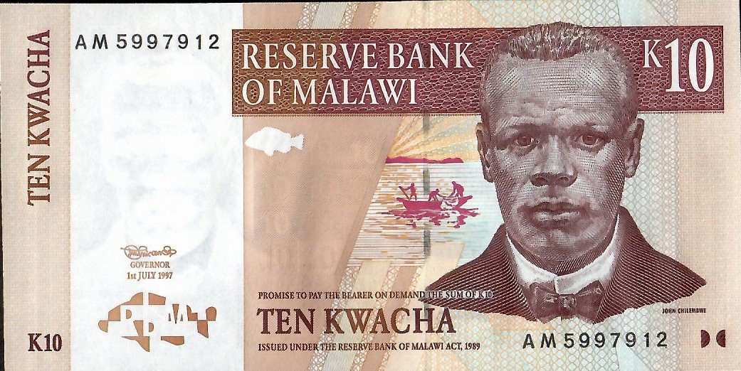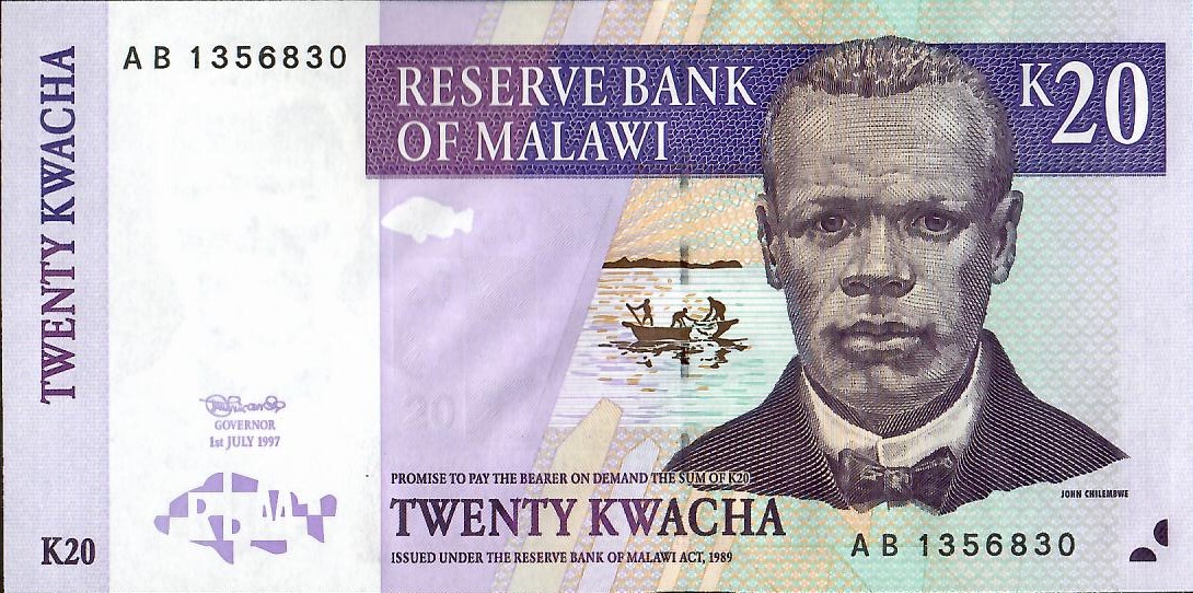 1.7.1997. Dark brown and brown-violet on multicolored underprint. J. Chilembwe at right and as watermark, sunrise, fishermen at center, bank stylized logo at lower left. Children in 'bush school' at left, bank seal at top center right on back.