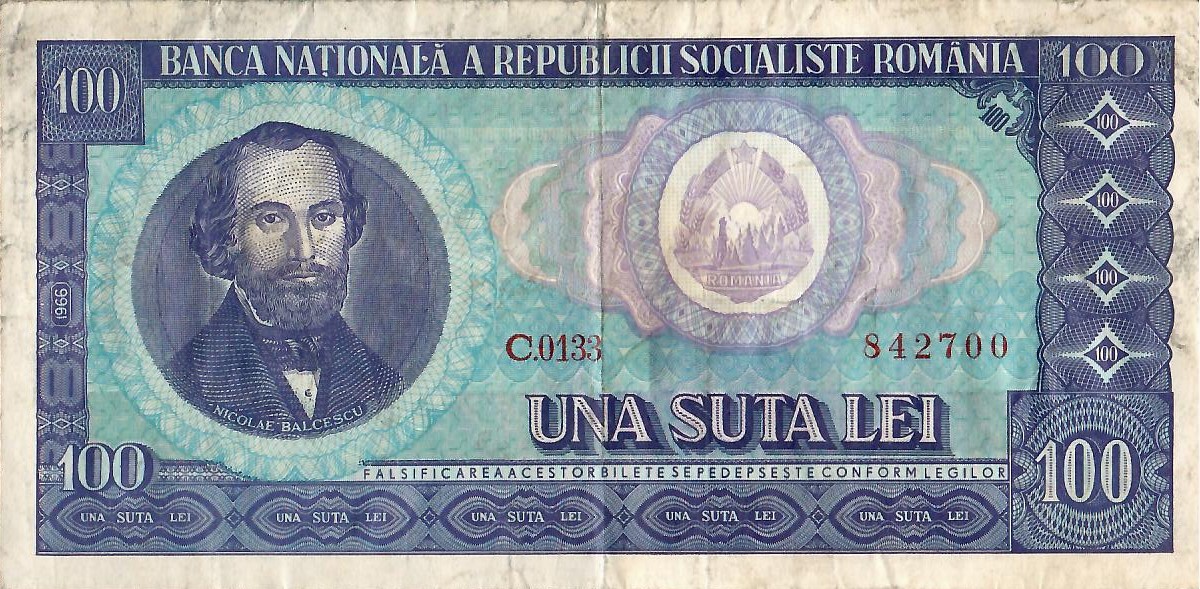 1966. Dark blue and purple on multicolor underprint. Portrait of Nicolae Balcescu at left. Arms at center right. Back: The Athenaeum in Bucharest at center right. Watermark: Rhombuses.