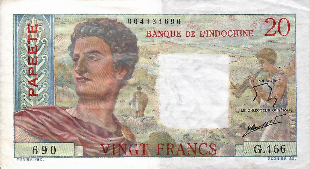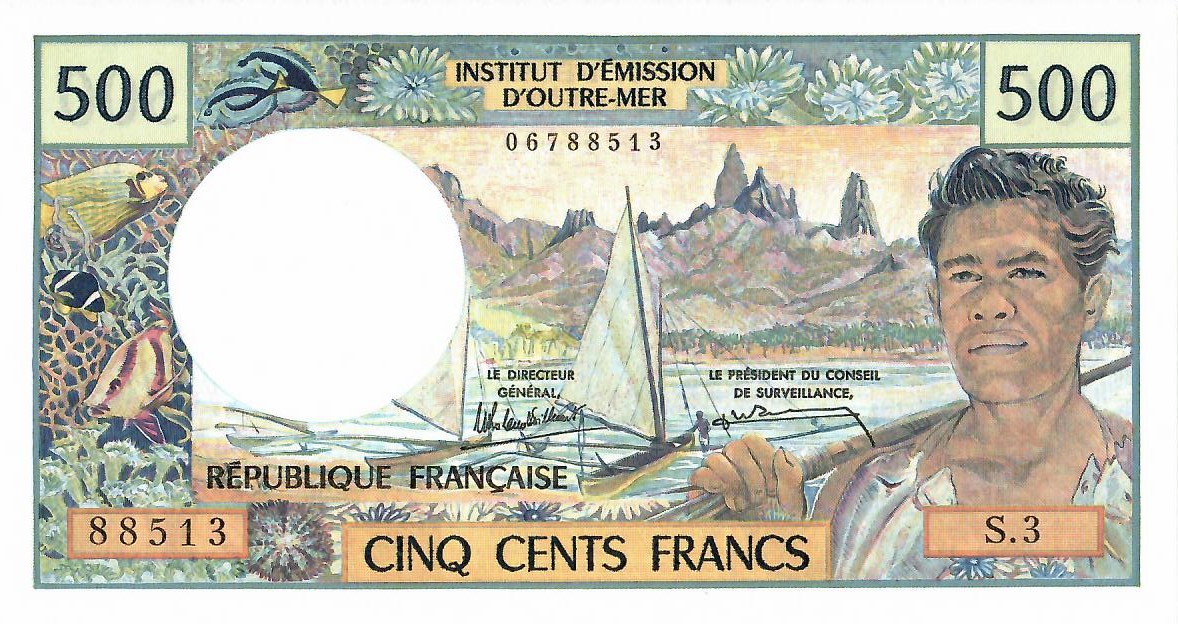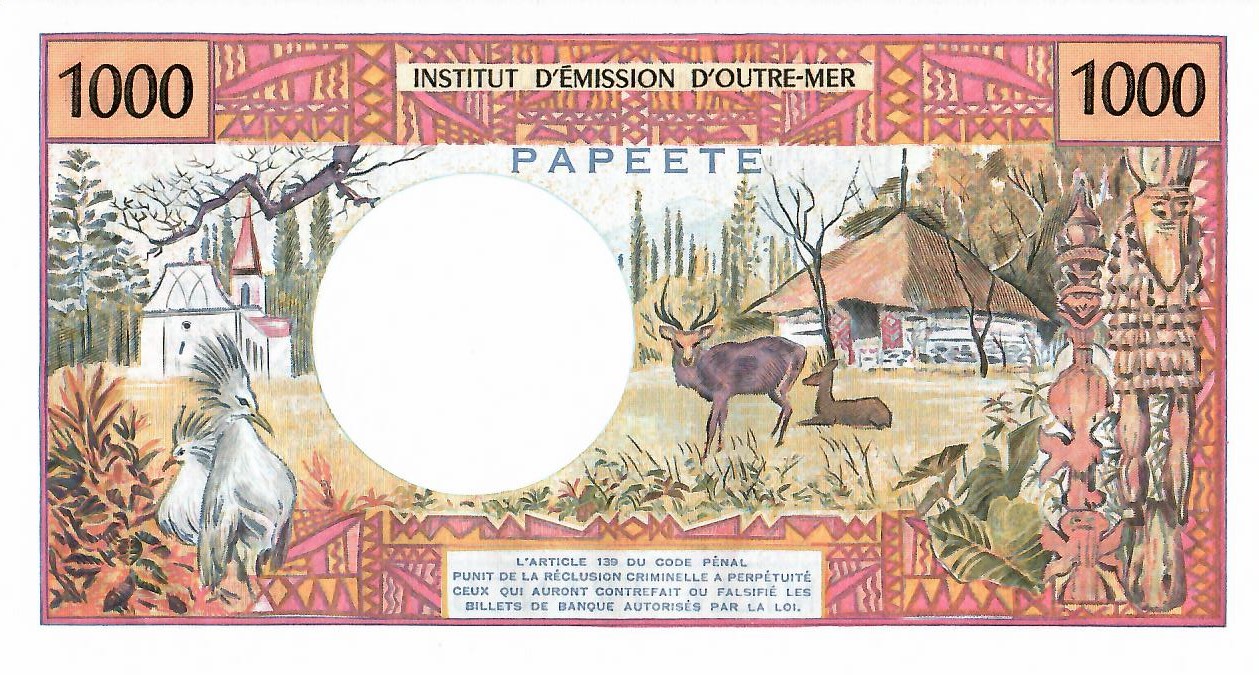 ND (1985). Dark brown on multicolor underprint. Hut under palms at left, girl at right. With overprint REPUBLIQUE FRANCAISE overprint at bottom center. Back: Kagu, deer, buildings, native carvings. Watermark: Marianne.