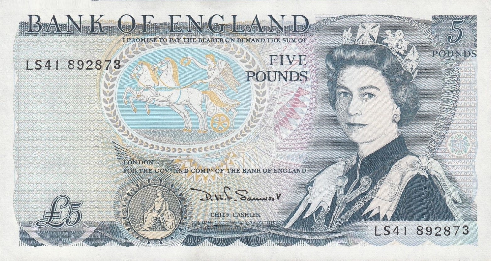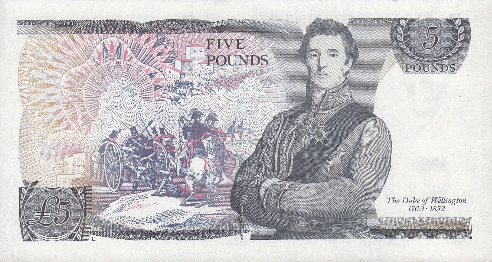 ND (1980-1987). Blue-black and blue on multicolored underprint. Portrait of Queen Elizabeth II in court robes at right. Duke of Wellington at center right, battle scene in Spain at left center on back and in watermark. Black signature. Thin security thread.