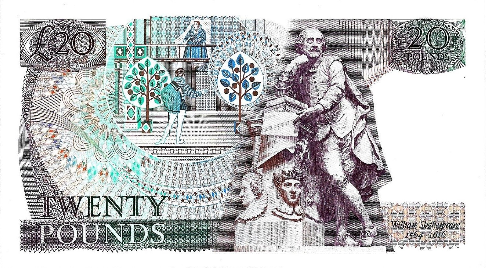 ND (1981-1984). Purple on multicolored underprint. Portrait of Queen Elizabeth II in court robes at right. Shakespeare statue at center right on back. Watermark: Queen Elizabeth II.