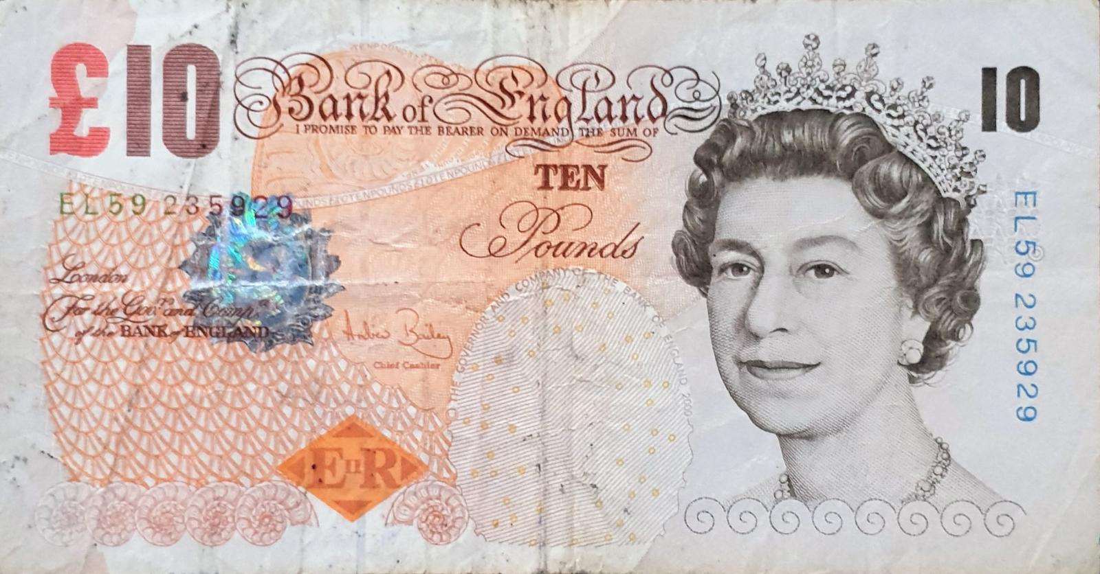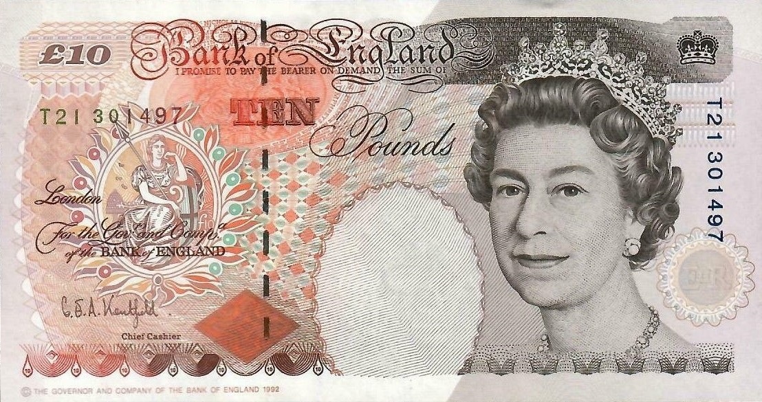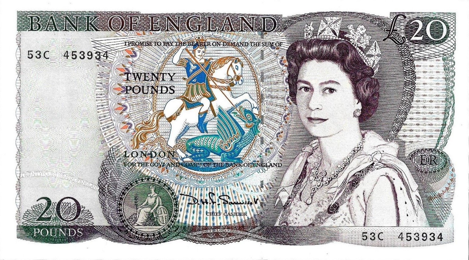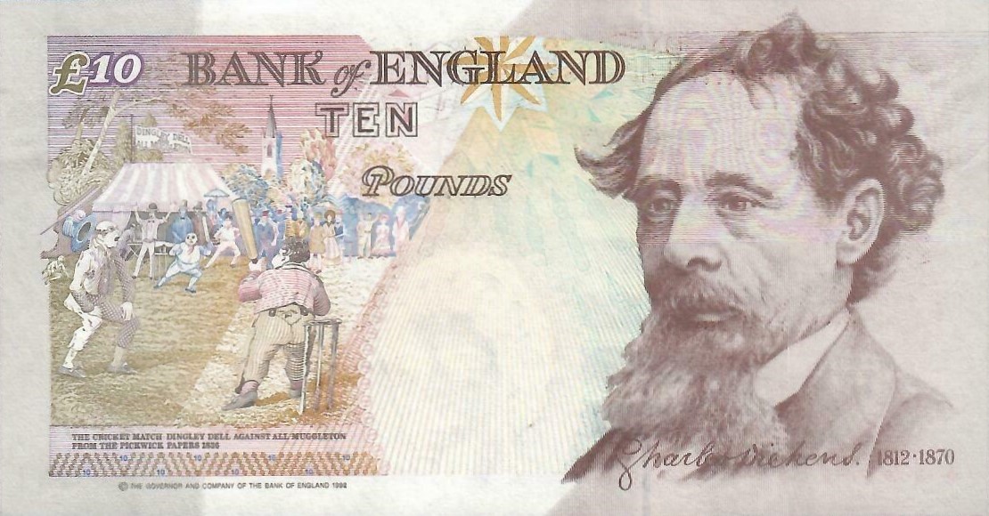 Copyright 1992 (1992-1993). Black, brown, and red on multicolored underprint. Queen Elizabeth II at right and as watermark. Crown at upper right corner on face. Britannia seated at left. Cricket match at left, Charles Dickens at right on back.