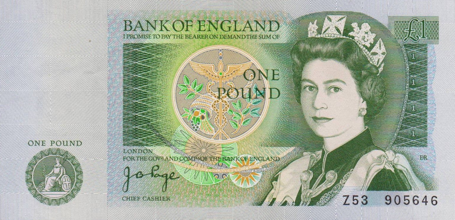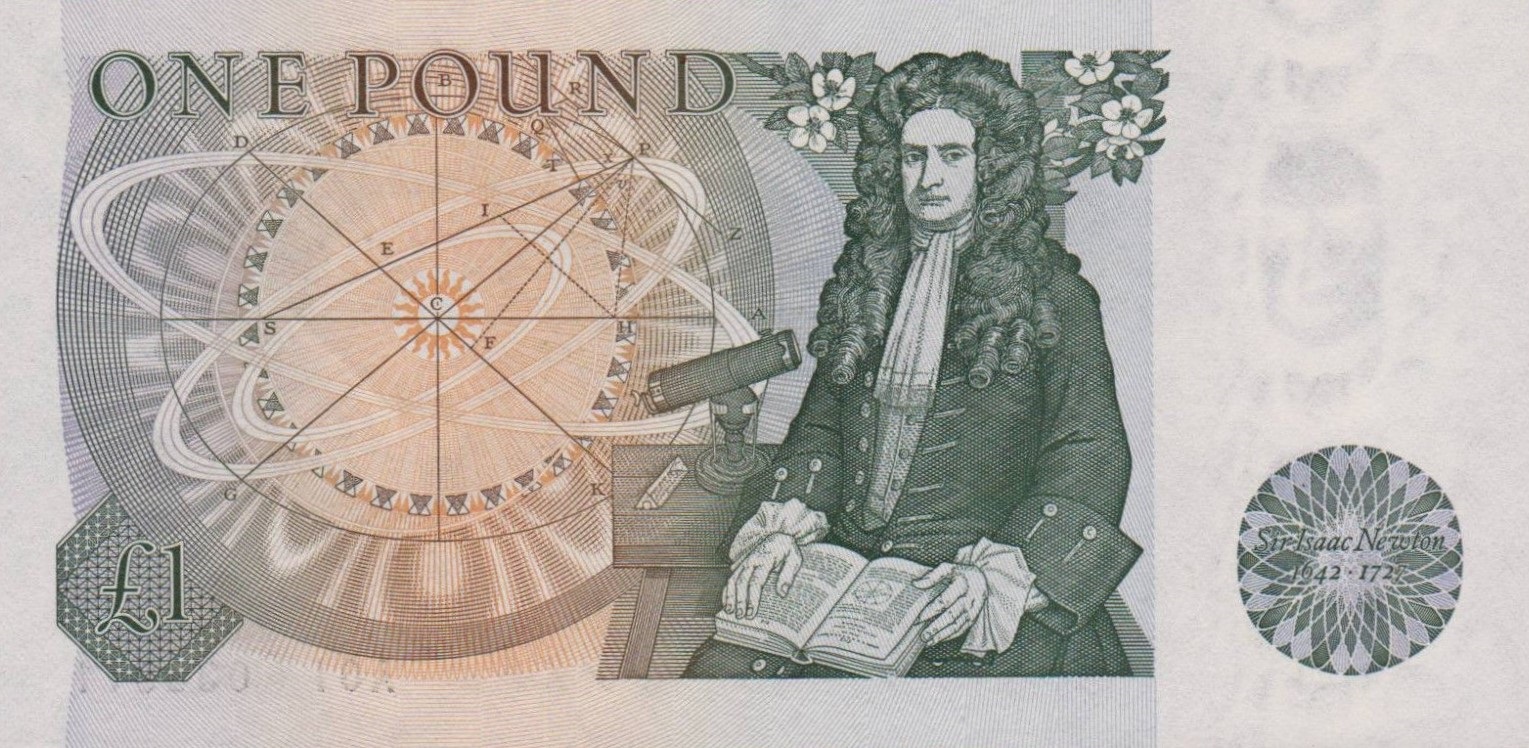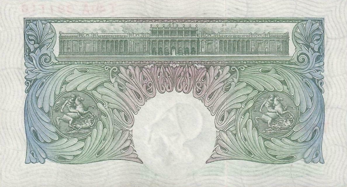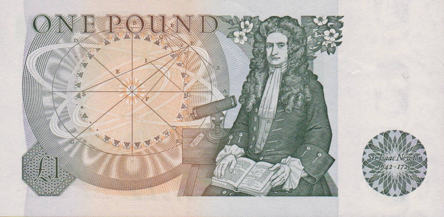 ND (1978-1980). Deep green on multicolored underprint. Portrait of Queen Elizabeth II in court robes at right. Back guilloches light gray at lower left and right corners. Sir Isaac Newton at center right on back and in watermark. Green signature.