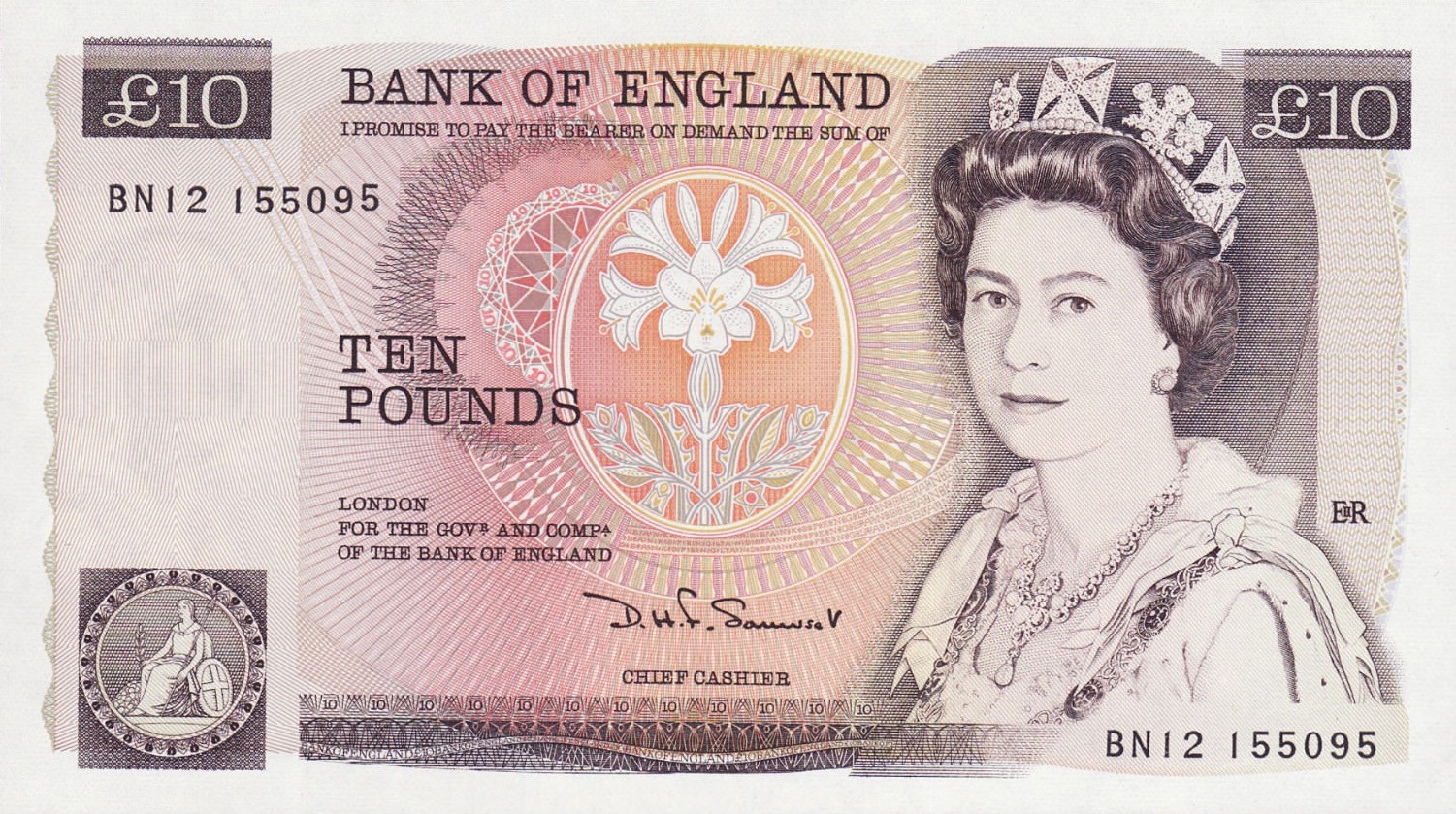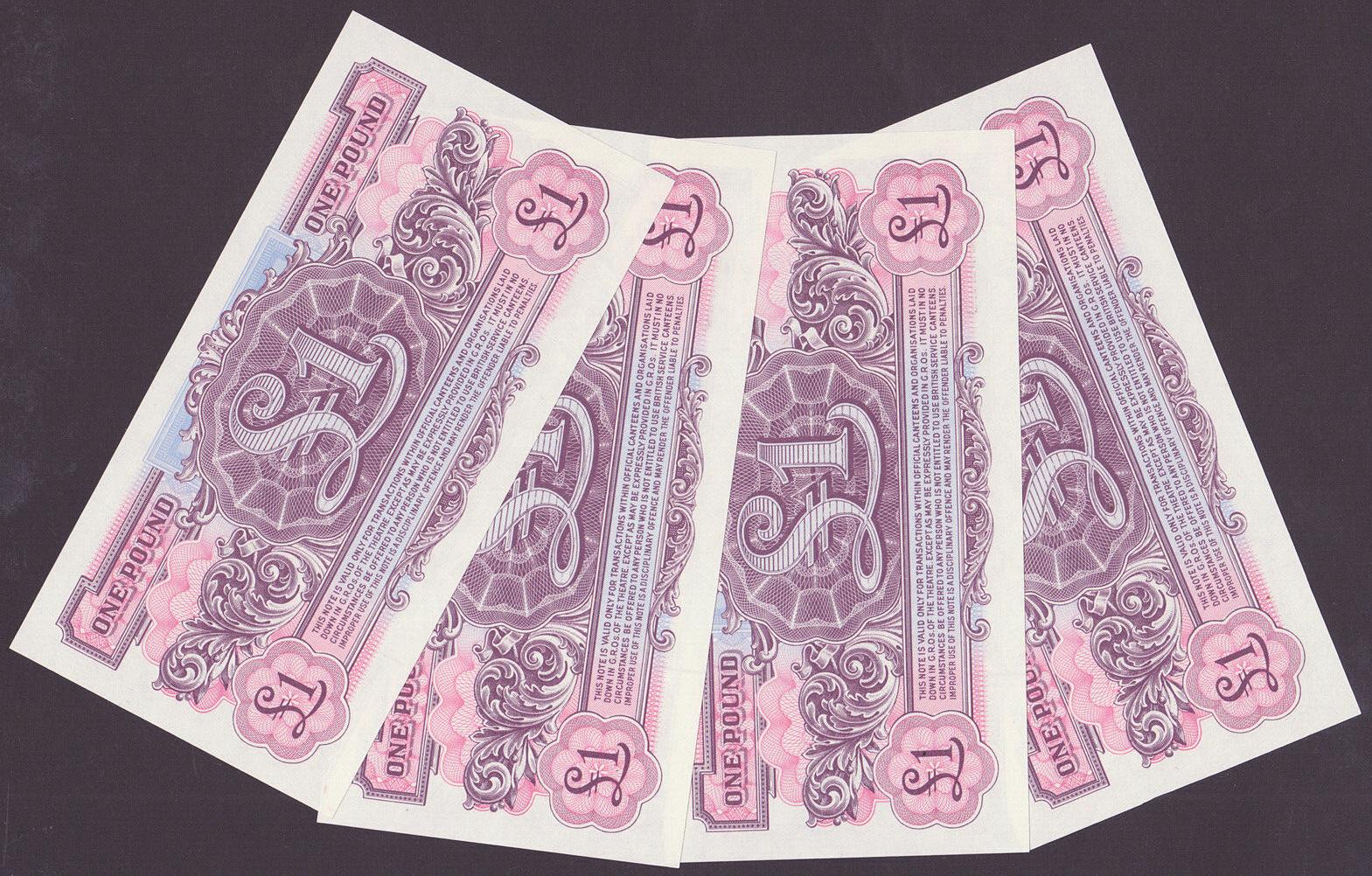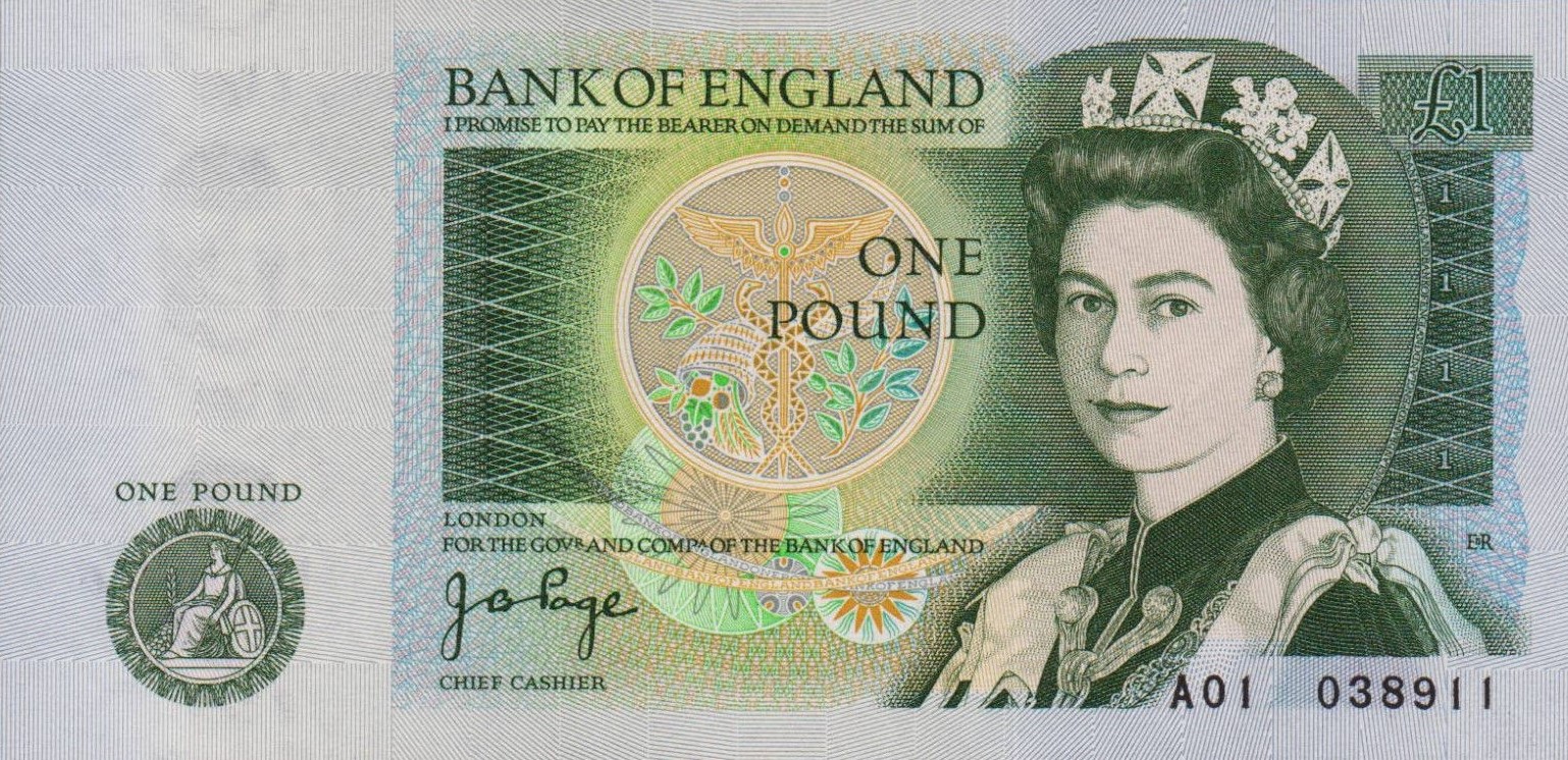ND (1978-1980). Deep green on multicolored underprint. Portrait of Queen Elizabeth II in court robes at right. Back guilloches light gray at lower left and right corners. Sir Isaac Newton at center right on back and in watermark. Green signature.
