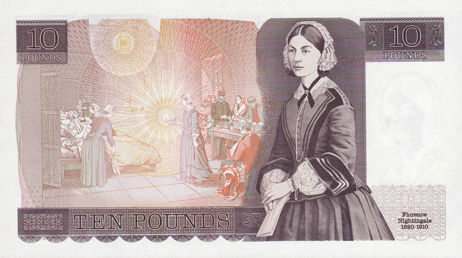 ND (1987-1988). Deep brown on multicolored underprint. Portrait of Queen Elizabeth II in court robes at right. Florence Nightingale at center right, hospital scene with Florence Nightingale as the "Lady With A Lamp" at left center on back and as watermark. With a segmented security thread.