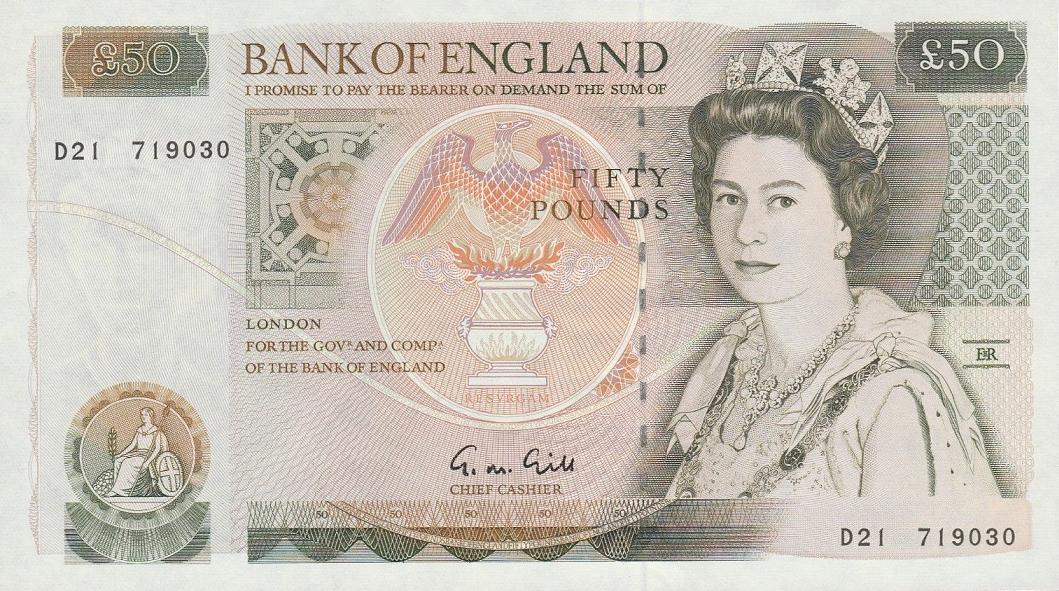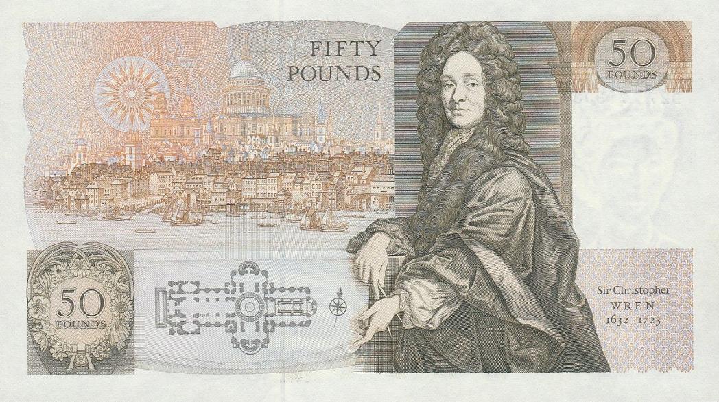 ND (1988-1991). Olive-green and brown on multicolored underprint. Portrait of Queen Elizabeth II in court robes at right. Watermark: Queen Elizabeth II at left, without imprint. View and plan of St. Paul's Cathedral at left, Sir C. Wren at center right on back. Modified background and guilloche colors. Segmented foil on security thread on surface.