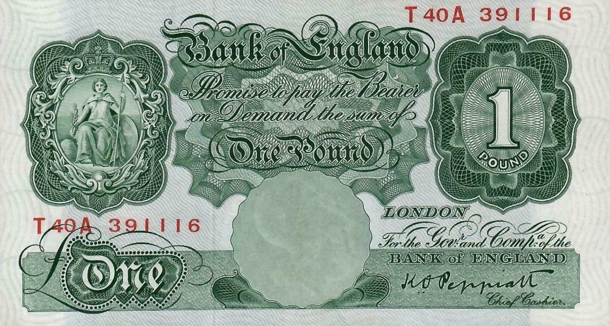 (1948-1949). Green. Seated Britannia at upper left. Paper with security thread. But with light blue cross at end of Demand on face.
