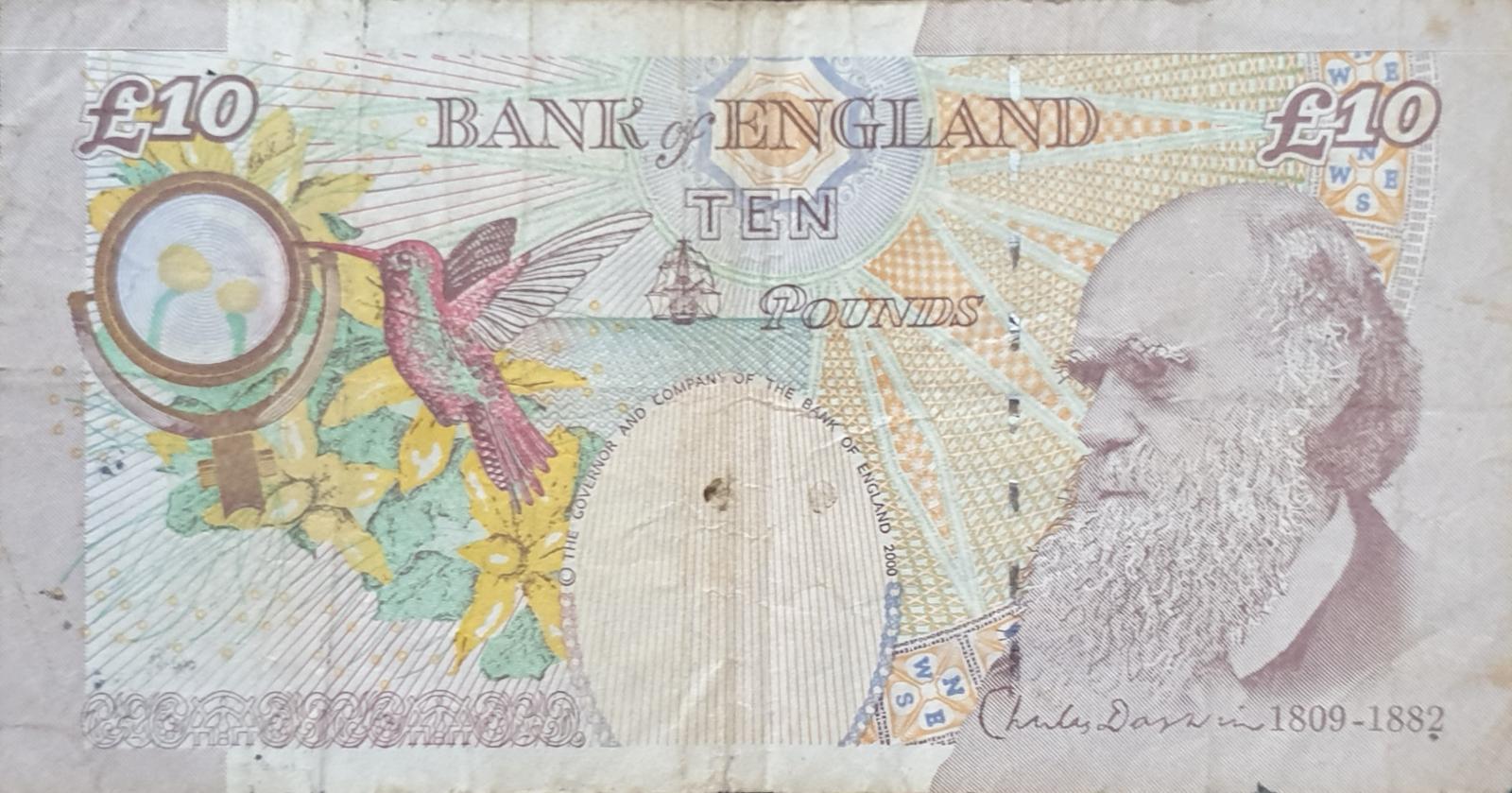 2004. Brown, orange, and multicolored. Queen Elizabeth II at right. Charles Darwin at right on back. Hummingbird magnifying glass and flora to left.