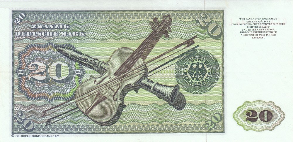 2.1.1980. Black and green on multicolored underprint. Elsbeth Tucher by Albrecht Durer at right and as watermark. Violin, bow, and clarinet on back. With DEUTSCHE BUNDESBANK 1961 on back.