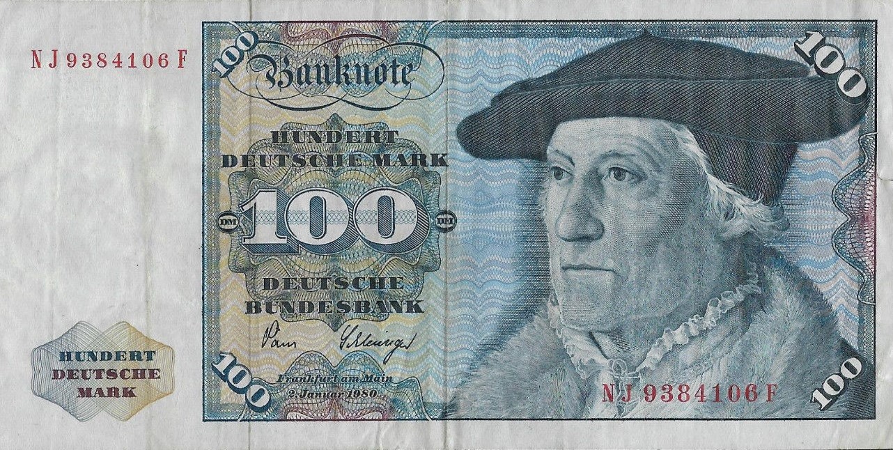 2.1.1980. Brown and olive-green on multicolored underprint. Portrait of Hand Urmiller by Barthel Beham at right and as watermark. Holsten-Tor gate in Lubeck on back. With DEUTSCHE BUNDESBANK 1962 on back.