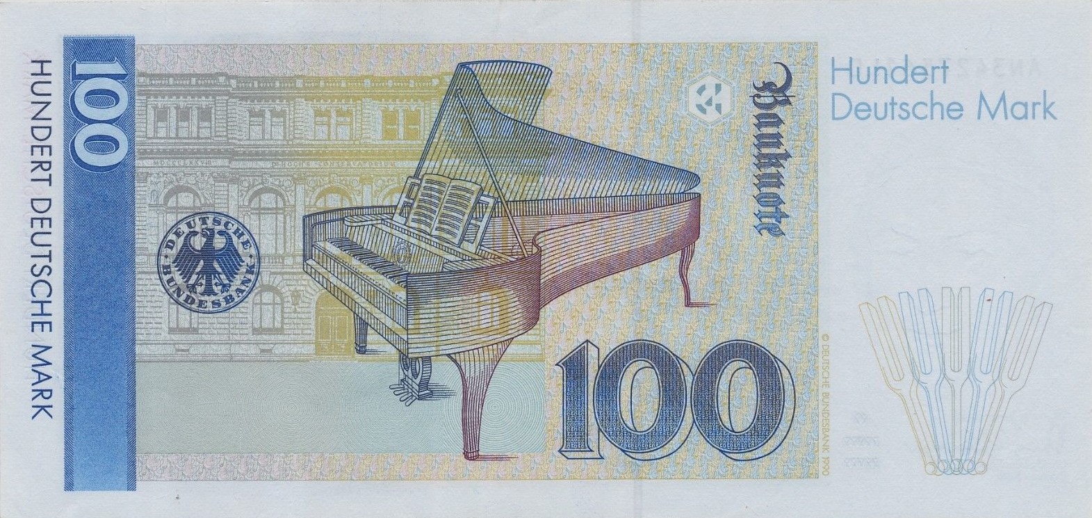 2.1.1989. Deep blue and violet on multicolored underprint. Clara Schumann at center right. Building at left in background, grand piano at center, multiple tuning forks at lower right in watermark area on back.