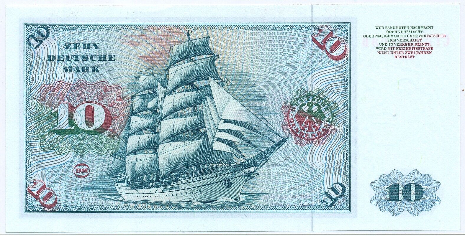 2.1.1980. Blue on multicolored underprint. Young man by Albrecht Durer at right and as watermark. Sail training ship Gorch Fock on back. With DEUTSCHE BUNDESBANK 1963 on back.