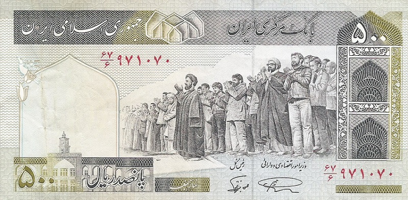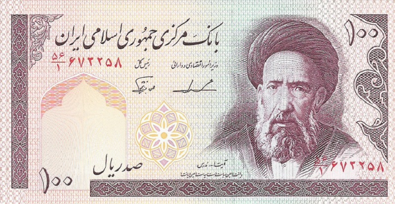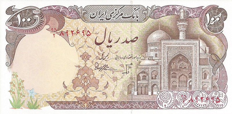 ND (1981). Maroon and light brown on multicolored underprint. Imam Reza shrine at Mashad at right. Madressa Chahr-Bagh in Isfahan on back. Watermark: Republic seal. White security thread with BANK MARKAZI IRAN in black Persian script runs vertically. Printer: TDRL (without imprint).