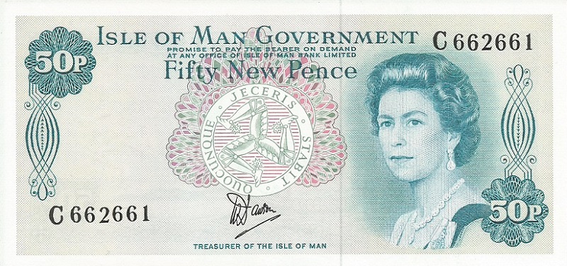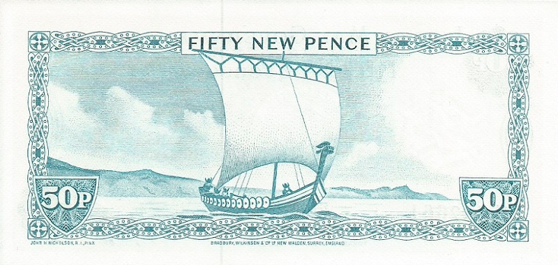 ND. Blue on multicolored underprint. Triskele arms at center and as watermark, older portrait of Queen Elizabeth II at right. Signature title TREASURER OF THE ISLE OF MAN. Printer: BWC. Old sailing boat on back.